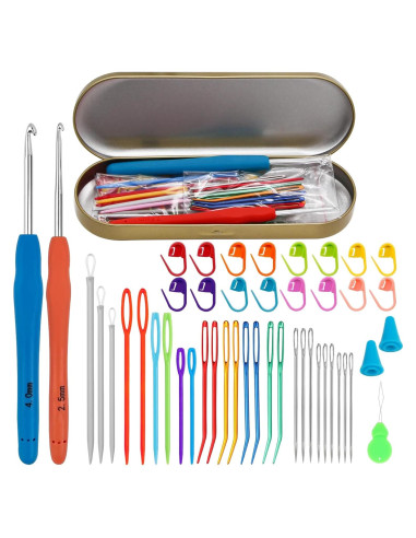 - Componentes incluidos: 8pcs agujas de hilo de punta curvada (2.75in (7cm)), 9pcs agujas de ojo grande (1.97in (5cm), 2.36in (6cm), 2.76in (7cm)), 6pcs agujas de plástico (2.16in (5.5cm), 2.75in (7cm), 3.54in (9cm)), 3pcs agujas de nylon (2.72in (7cm), 3.07in (8cm), 3.5in (9cm)), 30pcs marcadores de puntos, 5pcs protectores de puntas de agujas, 2pcs ganchillos (5.51in (14cm)), 1pc enhebrador de agujas, 1pc caja de almacenamiento de metal