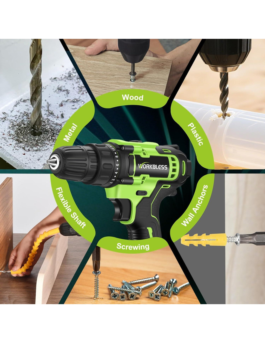 - Rendimiento Potente: El kit de taladro inalámbrico WORKBLESS entrega 354 pulgadas-libra (40 Nm) de torque máximo con 18+1 configuraciones de torque, y su potente motor proporciona energía constante en el trabajo para perforar madera, metal y atornillar con precisión.
