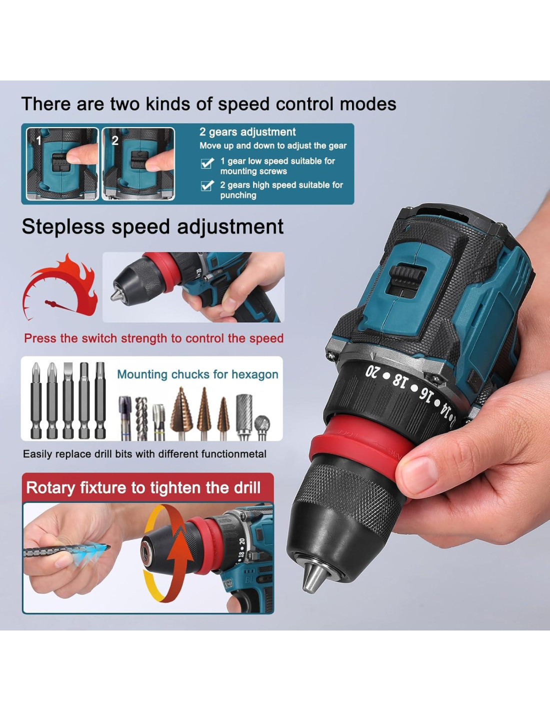 - Motor de alta calidad: El taladro Mulcort con motor superior, par máximo de 398in-lbs (45N.m). Con el duradero motor de cobre sin escobillas, que no produce chispas, puede aumentar en gran medida la estabilidad y eficiencia de su trabajo. Es perfecto para perforar madera, plásticos, metal, tareas de atornillado y muchos otros proyectos de DIY y manualidades. Este conjunto de taladro es un buen regalo ideal para nosotros, la familia y amigos.