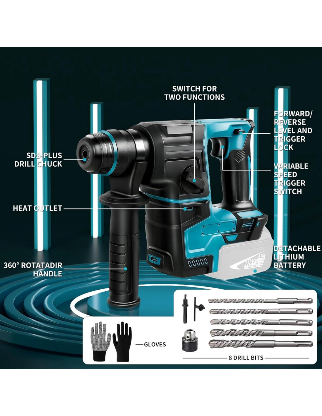- Lo que obtienes: 1 x martillo rotativo inalámbrico, 5 x brocas (6mm, 8mm, 10mm, 12mm, 14mm), 1 x portabrocas, 1 x conector, 1 x llave, 1 x mango ajustable 360, 1 x guantes, 1 x manual del usuario. Si tienes algún problema al usar, no dudes en contactarnos