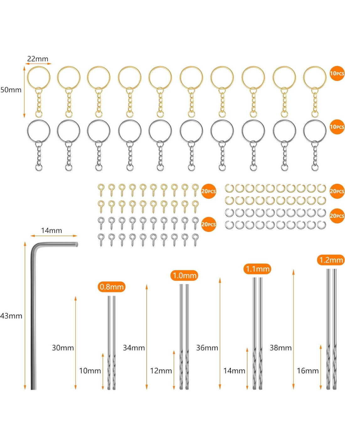 - Recibirás: el paquete viene con 1 pieza de taladro eléctrico con 8 piezas de brocas (0.8-1.2 mm), incluyendo 2 piezas de 0.8 mm, 2 piezas de 1.0 mm, 2 piezas de 1.1 mm, 2 piezas de 1.2 mm, 20 x anillos clave (dorado y plateado), 40 x pines de ojo de tornillo (dorado y plateado), 40 piezas de anillos abiertos de 7 mm (dorado y plateado), 1 pieza de llave, 110 piezas en total.