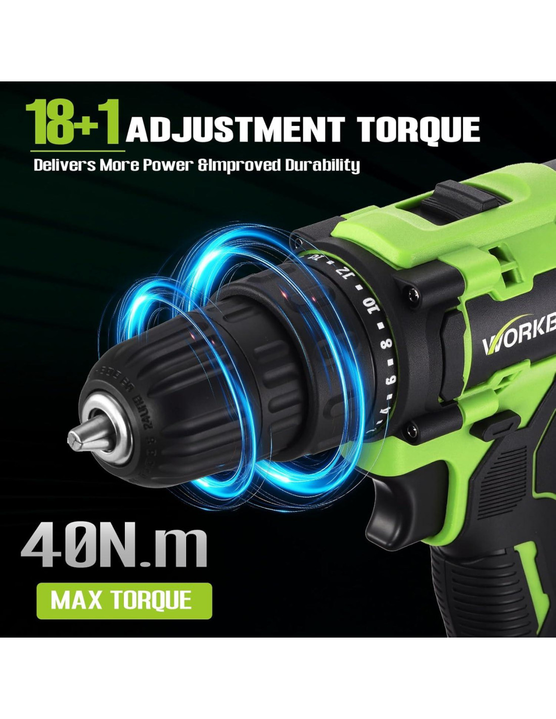 - Rendimiento Potente: El kit de taladro inalámbrico WORKBLESS entrega 354 pulgadas-libra (40 Nm) de torque máximo con 18+1 configuraciones de torque, y su potente motor proporciona energía constante en el trabajo para perforar madera, metal y atornillar con precisión.