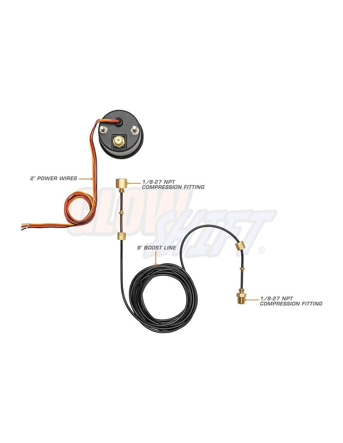 - Lecturas mecánicas de presión de sobrealimentación de 0 a 60 PSI - Medidor de 2-1/16" (52mm) de diámetro con un dial negro, aguja iluminada de color rojo, lente ahumada, anillo de trim negro mate y carcasa de aluminio