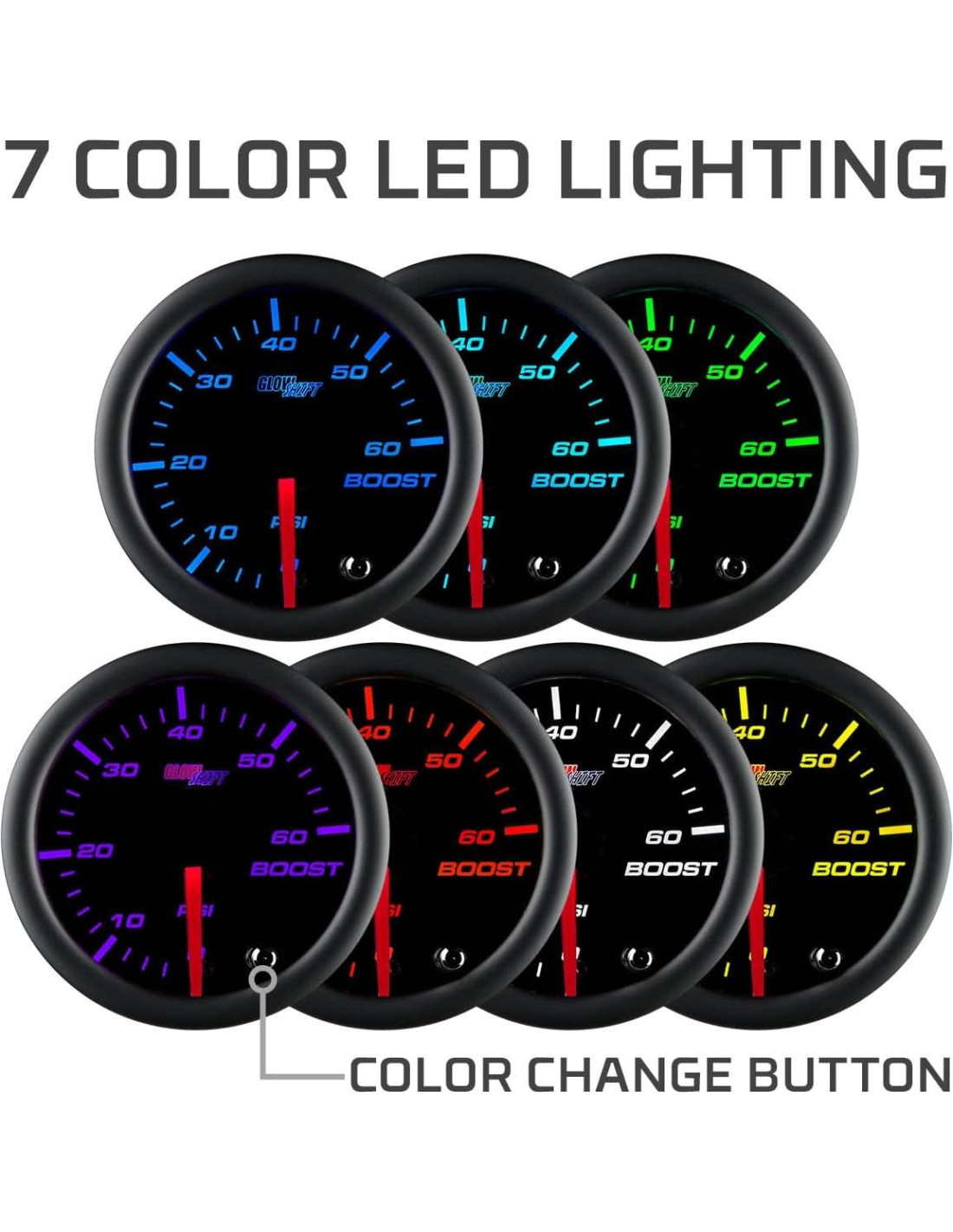 - El Medidor de Presión de Turbo Mecánico GlowShift Tinted 7 Color 60 PSI está diseñado para monitorear los niveles de presión de sobrealimentación del turbo o motor sobrealimentado de su camión diésel