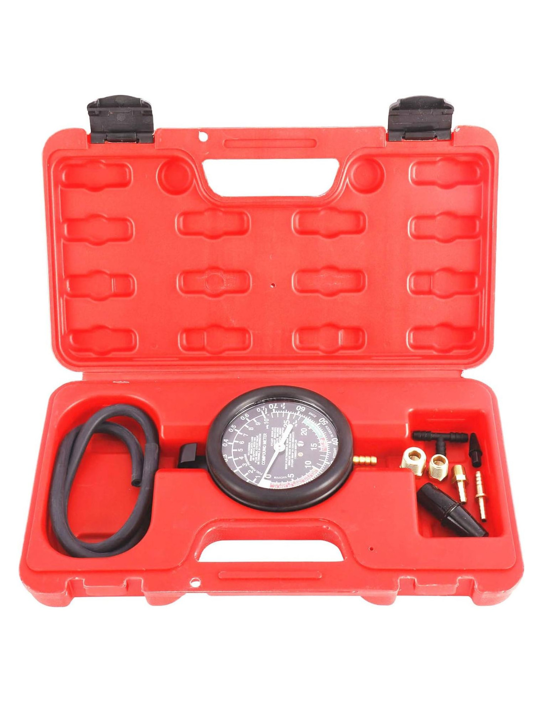 - El paquete incluye (1) medidor de presión de vacío, (1) manguera de goma de 24 pulgadas (60,96 cm) de largo, (1) adaptador de cono de latón, (1) conector de plástico, (1) adaptador de latón macho de 1/4 x 18 a hembra de 1/8-27, (1) adaptador de latón macho de 1/8-27 a fitting de latón con barbilla de 7/32, (1) adaptador de latón hembra de 1/8-27 a macho de 3/8, (1) adaptador de fitting de latón con barbilla de 7/32 tipo T y (1) estuche de transporte