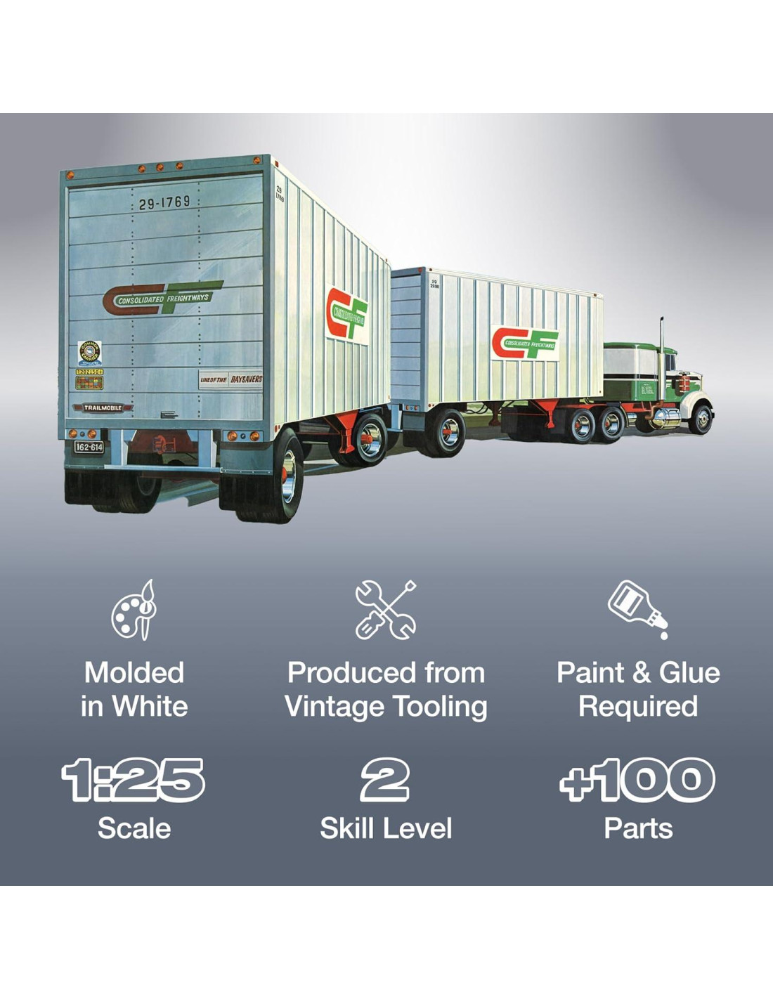 - ASPECTO REALISTA: Una vez construidos, estos remolques de furgón a escala 1/25 se verán exactamente como el original, completos con soportes de aterrizaje ajustables, puertas traseras deslizantes operativas, una unidad de dolly convertidor auténtica y arte de calcomanía original recreado.
