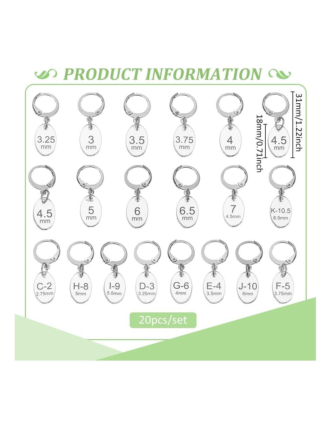 Recibirás 20 marcadores de puntos de acrílico transparente, aproximadamente 31mm (1.22 pulgadas) de largo, colgante: 15x9.5mm (0.59x0.37 pulgadas). El tamaño adecuado satisface tus diversas necesidades diarias de tejido. Cada óvalo está etiquetado con información sobre un tamaño diferente, así que elige los marcadores que deseas usar según tu proceso, para que puedas recordar fácilmente el tamaño de las agujas de tejer que estás usando o el tamaño de los ganchos de crochet que necesitarás preparar con anticipación para otros proyectos, para hacer que tus proyectos de manualidades DIY sean más eficientes. Genial para tejer, hacer crochet, manualidades DIY, álbumes de recortes, ropa de tela, etc., o cuélgalos en llaveros u otras manualidades, por supuesto, también puedes usarlos para hacer collares, pulseras, aretes u otras joyas hermosas.