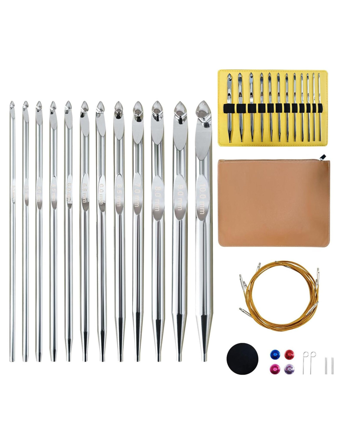 - Juego Completo de Ganchillos: Este juego de ganchillos tunecinos incluye 12 tamaños diferentes, de 3mm a 10mm, permitiendo una costura precisa y versatilidad en cualquier proyecto. El completo set de 26 piezas viene organizado de manera ordenada en un elegante estuche de cuero color camel, incluyendo: 12 ganchillos, 4 cables giratorios, 4 tapas finales, 2 conectores, 2 llaves de retención, un espaciador antideslizante y una bolsa de manualidades portátil