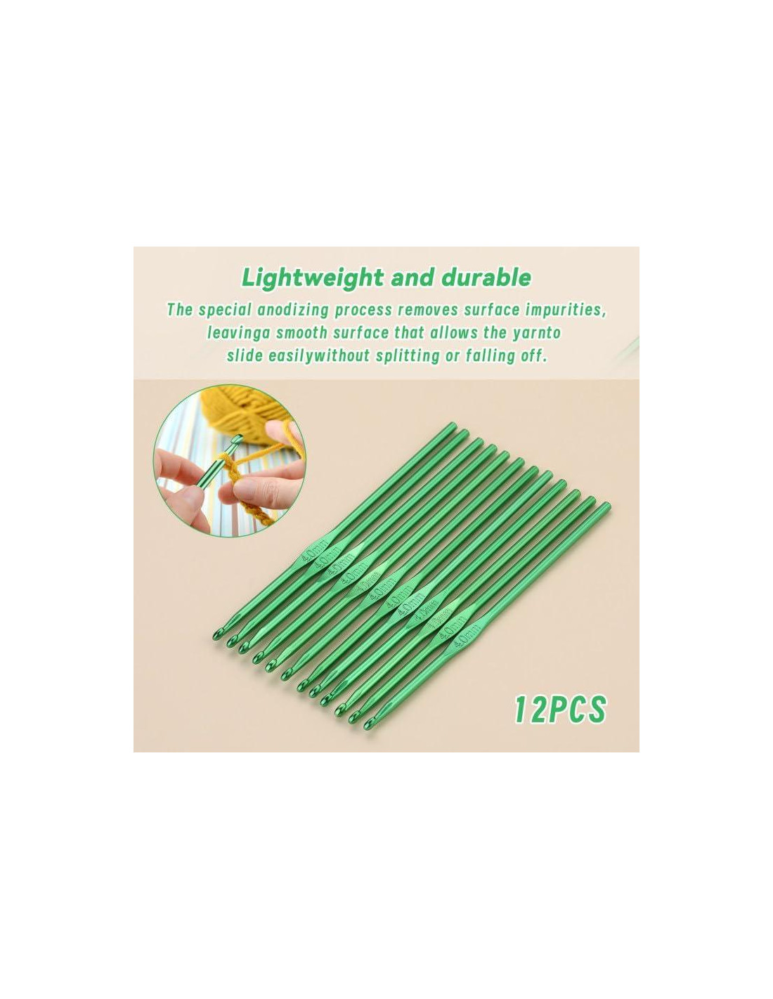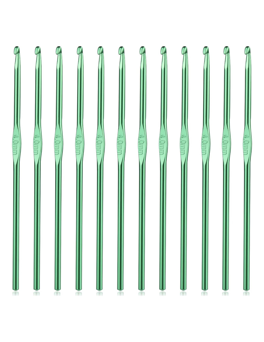 - Lista del Paquete: El juego de ganchos de crochet contiene 12 ganchos de crochet del mismo tamaño, todos son ganchos de crochet verdes de tamaño 4mm, longitud total del gancho de crochet: 15cm (5.9 pulgadas), longitud de la punta de la aguja de crochet: 0.6cm (0.24 pulgadas), ancho de la punta de la aguja de crochet: 0.2cm (0.08 pulgadas). Estos ganchos de crochet tienen marcas de tamaño en la superficie para evitar confusiones, y son adecuados tanto para principiantes como para amantes del crochet experimentados.