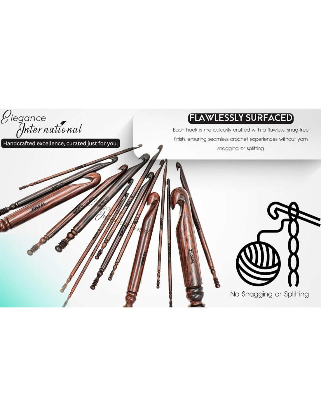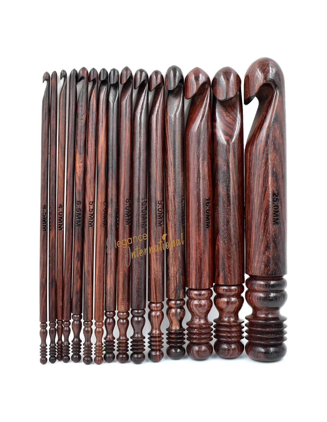 Tamaños en el Juego de 15 Ganchillos: 3.5mm, 4mm, 4.5mm, 5mm, 5.5mm, 6mm, 6.5mm, 7mm, 8mm, 9mm, 10mm, 12mm, 16mm, 19mm, 25mm | Longitud: 17.78 cm (7 pulgadas) más larga CALIDAD ALTA: Estos ganchillos están hechos a mano con la más alta calidad de Madera de Rosa, proporciona un confort y control excepcionales, estos ganchillos están diseñados con mangos ergonómicos de agarre suave no solo para comodidad sino también para asegurar que no se deslicen de las manos mientras se hace ganchillo. Son suaves y se deslizan sin esfuerzo a través del hilo. PRECISIÓN: Cada tamaño de nuestro ganchillo es preciso, cuando se trata del tamaño de los ganchillos siempre habrá imprecisiones en la medición de los tamaños de ganchillos de otras marcas, pero nuestra marca Elegance International proporciona los tamaños precisos de cada ganchillo para que nunca tengas que enfrentar ninguna dificultad al hacer tus proyectos de ganchillo al elegir qué tamaño debes usar. DISEÑO ERGONÓMICO: Los mangos ergonómicos alivian la fatiga de la muñeca y la mano que a menudo viene con el ganchillo a largo plazo. Un ganchillo diseñado ergonómicamente siempre será el mejor, especialmente para aquellos que sufren de artritis, dolor de mano o dolor de muñeca mientras hacen ganchillo. El mango del ganchillo ergonómico tiene el agarre más cómodo que permite a las personas hacer ganchillo con menos dolor. IDENTIFICACIÓN FÁCIL: Cada ganchillo está grabado con los tamaños precisos para una identificación fácil que es claramente visible y más fácil de identificar el tamaño del ganchillo. Así que no enfrentas ningún problema al elegir qué tamaño debes usar. REGALO PERFECTO: Servirá como un regalo perfecto para el tejedor y ganchillero en tu vida. ¡Garantizado para hacerlos sonreír! Gran elección para regalar en Navidad, Cumpleaños, Día de la Madre, Día de San Valentín o cualquier ocasión.