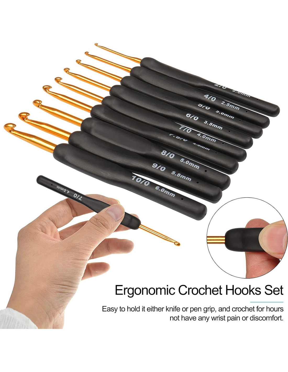 - [Juego de Agujas de Ganchillo Ergonómicas] La mayor ventaja de estas agujas de ganchillo ergonómicas es su empuñadura de confort elastomérica. El material del bonito mango negro es suave y agradable al tacto, lo que es muy duradero y fácil de sostener. Puedes sostenerlo ya sea con agarre de cuchillo o de bolígrafo, y ganchillar durante horas sin tener dolor o incomodidad en la muñeca.