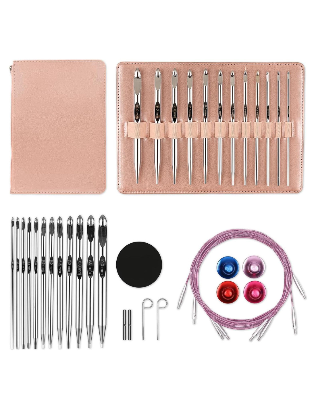 - Ganchillos Intercambiables: Este es un kit de ganchillos versátil que te permite cambiar ganchillos libremente, permitiéndote crear una multitud de patrones de tejido. Estos ganchillos permiten crear diversas telas, desde grandes mantas hasta pequeñas muñecas, incluyendo chales, suéteres, bufandas, sombreros, ramos, decoración del hogar y más artículos de ganchillo