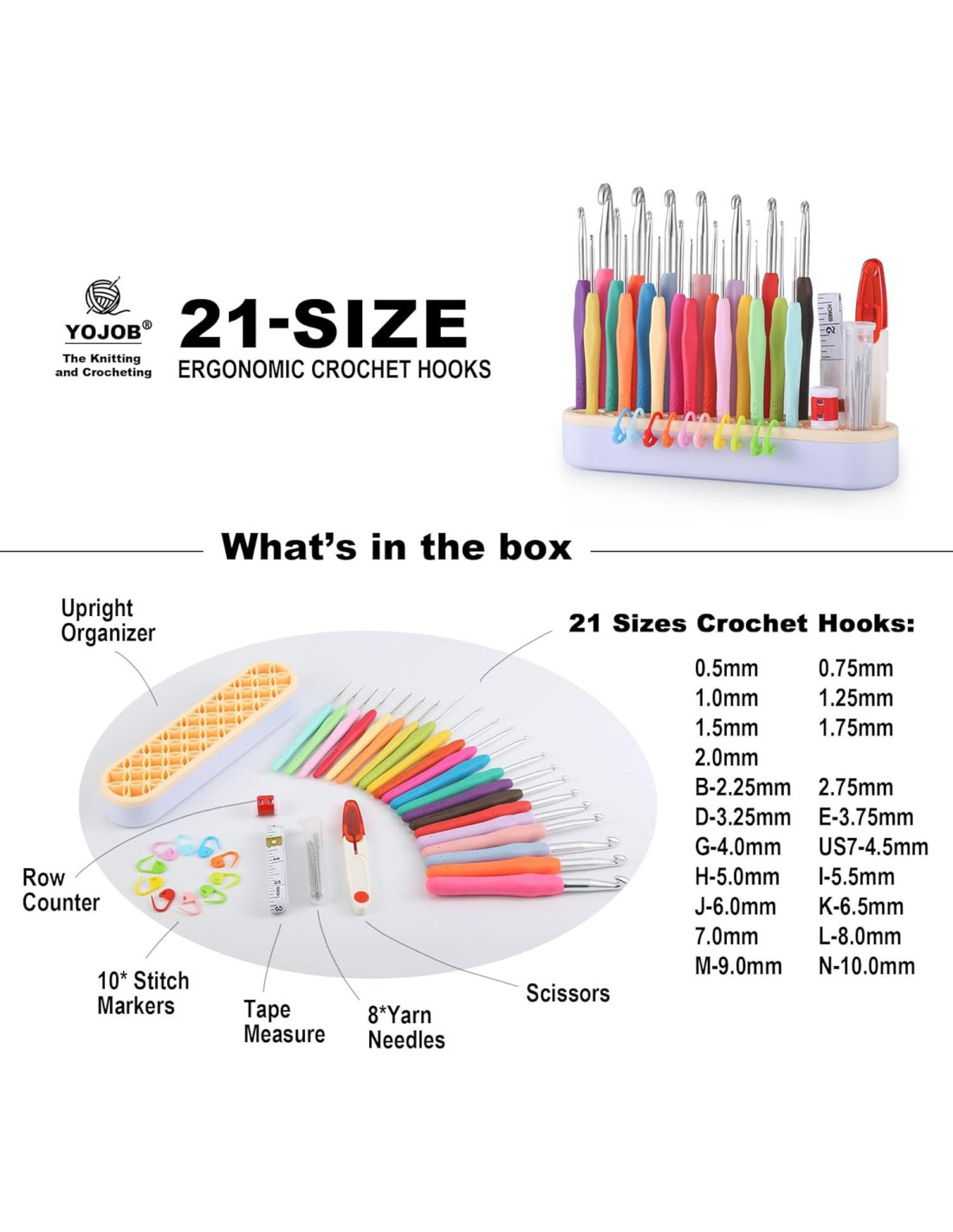 YOJOB.LLC es una empresa familiar que se especializa en el diseño y producción de artículos de ganchillo. Nos enfocamos en productos y servicios de alta calidad humanizados, para asegurar que tus proyectos sean más rápidos, fáciles y felices. Yojob ha inspirado a más de 1,000,000 de personas en todo el mundo a comenzar su nuevo pasatiempo de ganchillo. Para obtener un nuevo pasatiempo, una nueva felicidad, y más... Creemos que el cambio está al alcance de tu mano. Toma un nuevo pasatiempo. Conoce nuevos amigos. Comienza un gran VIAJE. Disfruta de tu vida. Es así de simple. Regala a tus amigos amantes del ganchillo una nueva herramienta de ganchillo. Ganchille juntos. Comparte tus artes y amor con familiares y amigos. 21 tamaños (0.5mm-10mm). Cubre una amplia gama de tamaños, encaje, común y jumbo, que puede satisfacer todas las necesidades de ganchillo de cada temporada. Incluye 21 ganchillos de diferentes tamaños, que pueden cubrir todos los proyectos de ganchillo. También viene con 10 marcadores de puntos, 8 agujas de lana, 1 tijera, 1 contador de filas, 1 cinta métrica y un soporte único. Son fáciles de reconocer porque el tamaño diferente tiene colores diferentes. Nuestros ganchillos están diseñados para evitar deslizamientos o enganches. Las puntas cónicas facilitan la creación de puntos. Los ganchillos cuentan con empuñaduras de goma suaves para ayudar a aliviar la incomodidad. ¡Disfruta del ganchillo sin fatiga! Cada ganchillo tiene tanto la letra como el tamaño métrico en mm. Grabado en la parte frontal e impreso en la parte posterior. El juego de ganchillos también tiene un soporte que puede organizar tus piezas para evitar perderlas.