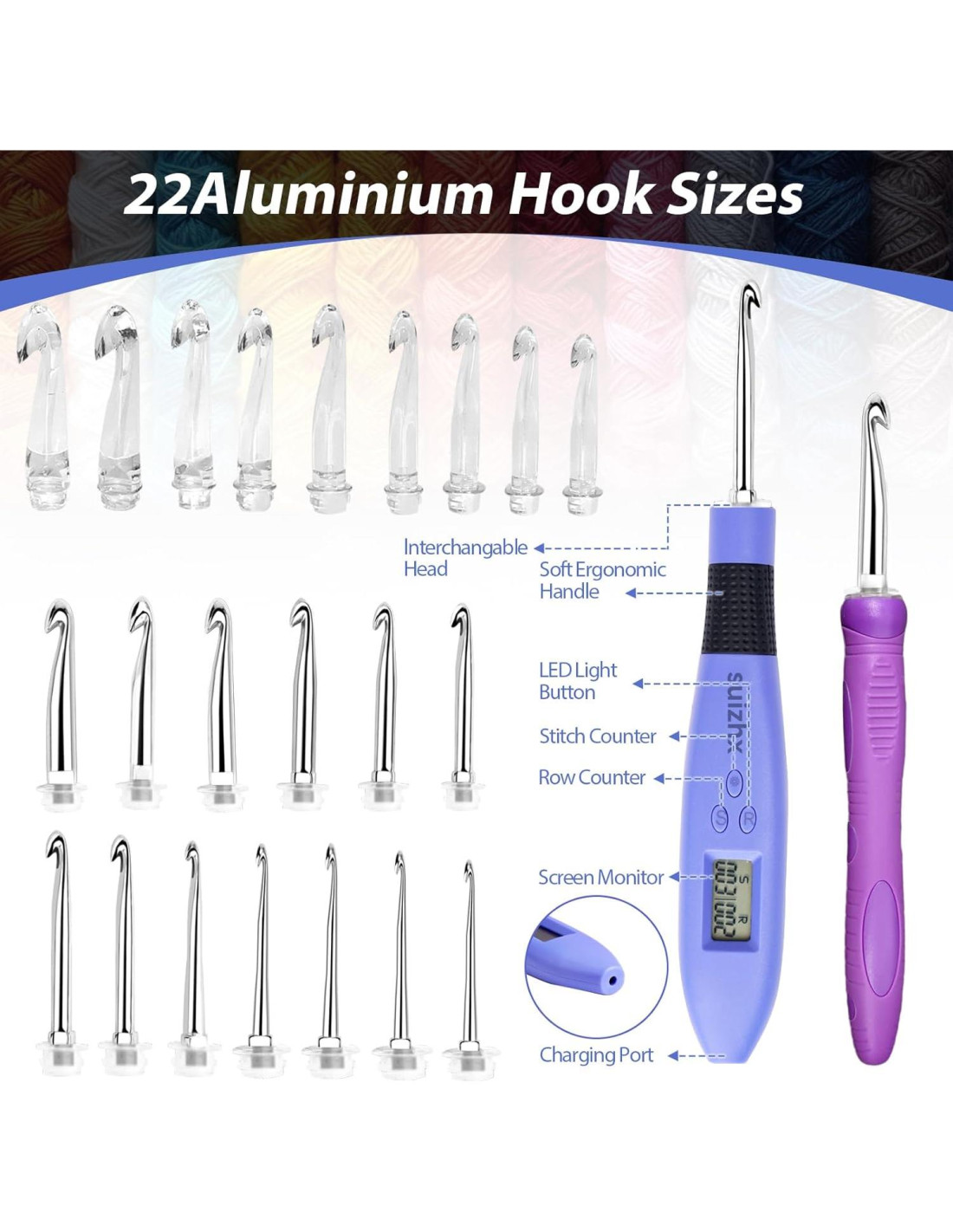 - Característica especial: Juego de Ganchillos Diseñado Ergonómicamente, ganchillo iluminado, Dos modos de iluminación ajustables, 22 Agujas de Ganchillo Intercambiables de Diferentes Tamaños