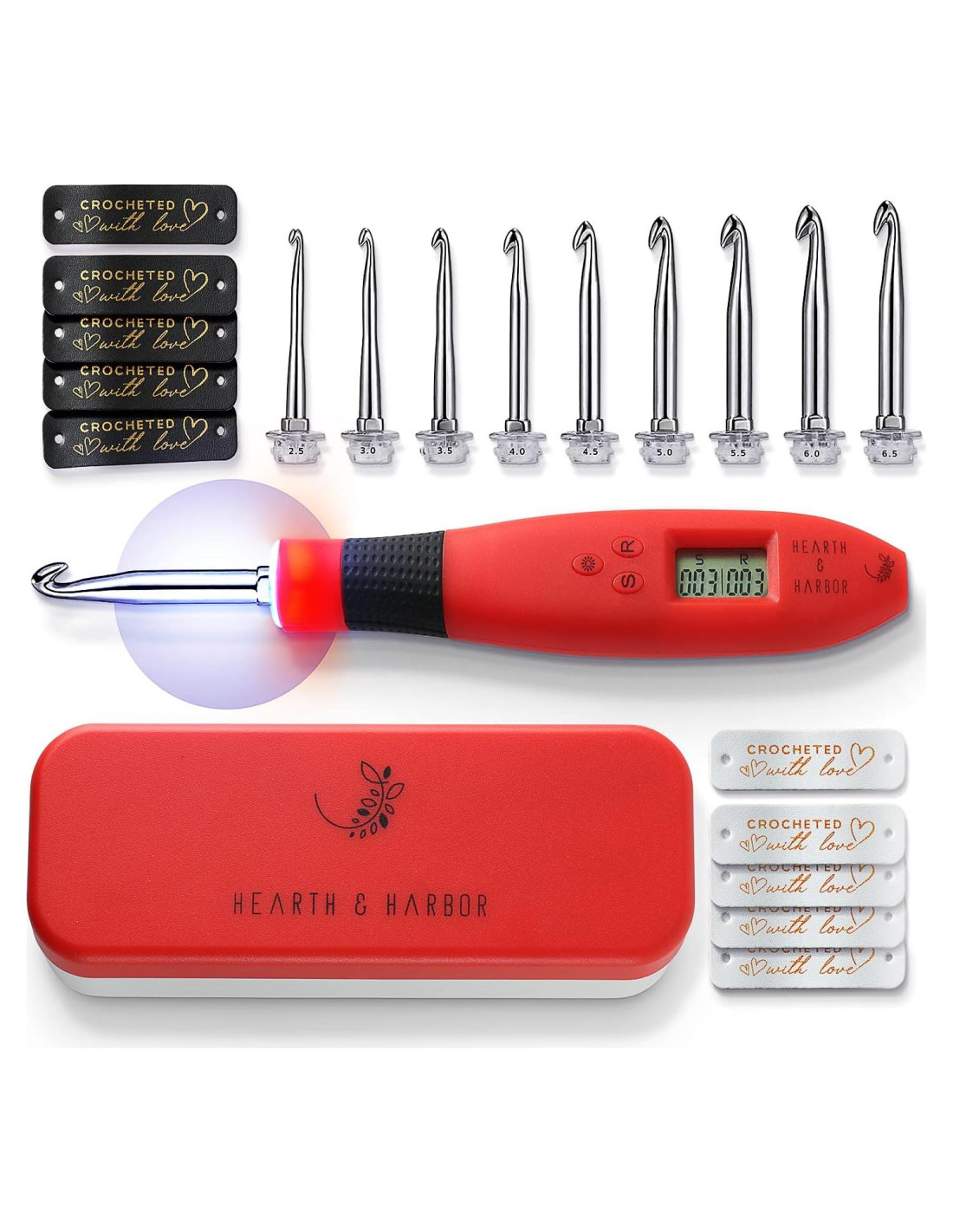 - Juego de Crochet con 10 Etiquetas: Usa este gancho de crochet eléctrico como contador de filas de crochet mientras creas regalos personalizados para familiares y amigos. Una etiqueta de cuero sintético añade el toque final.