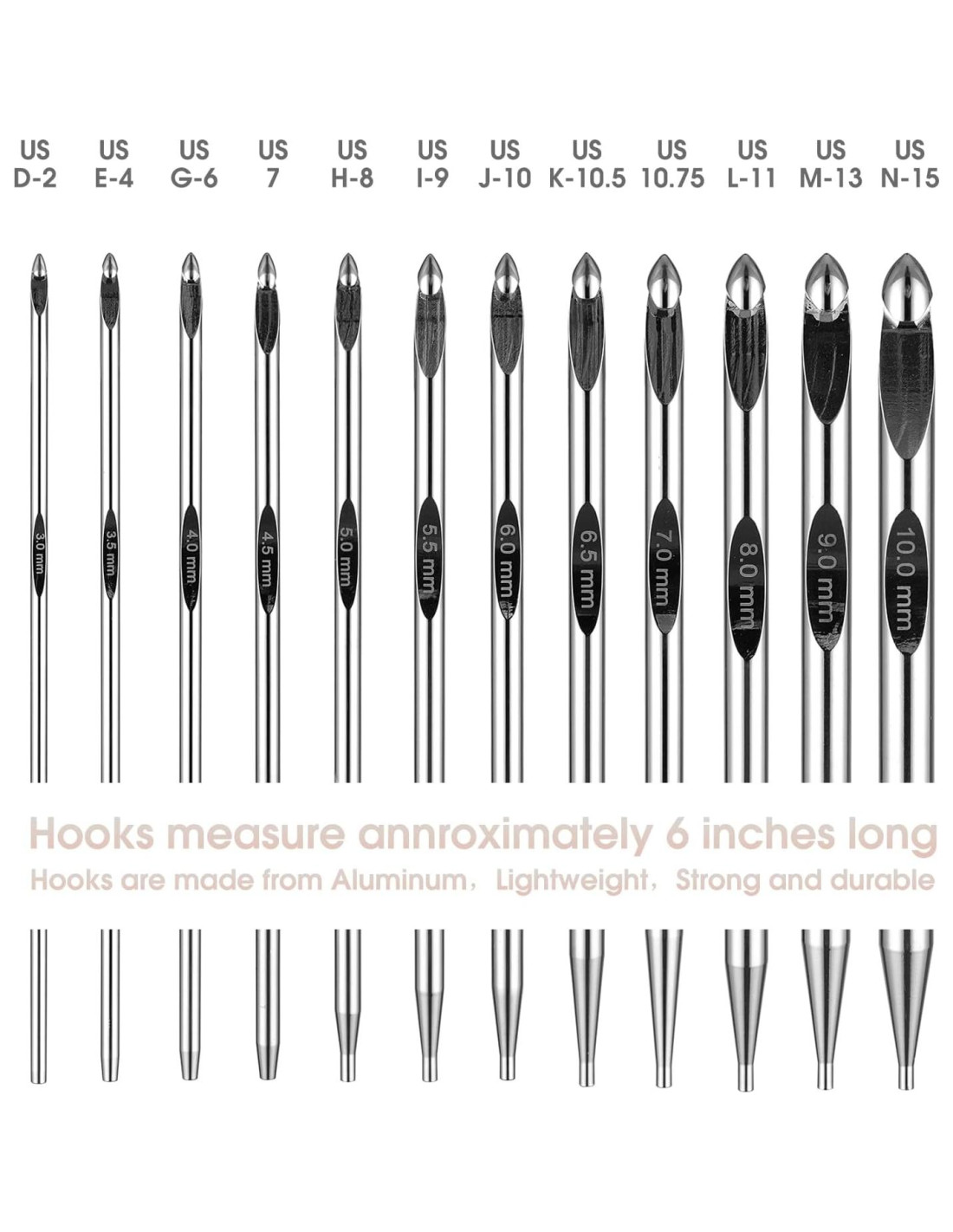 - Juego de Ganchillos Tunecinos: Incluye 12 puntas de ganchillo de 6" (15.24 cm) de largo US D2 / E4 / G6 / 7 / H8 / I9 / J10 / K10.5 / 10.75 / L11 / M13 / N15 (Métrico: 3mm / 3.5mm / 4mm / 4.5mm / 5mm / 5.5mm / 6mm / 6.5mm / 7mm / 8mm / 9mm / 10mm); 4 cables giratorios morados (universales); 4 tapas de extremo; 2 conectores; 2 llaves y 1 espaciador antideslizante y una bolsa de proyecto de manualidades