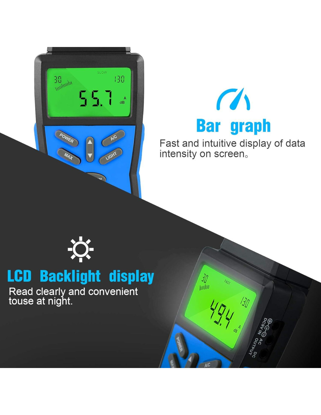 - Medidor de dB Multiusos: Función de retención máxima; Pantalla LCD de 5 dígitos con retroiluminación, fácil de leer en lugares oscuros; Se apagará automáticamente después de 10 minutos para ahorrar batería. Seleccione modo rápido/lento para ajustar el nivel de ruido o promediar niveles que cambian rápidamente.