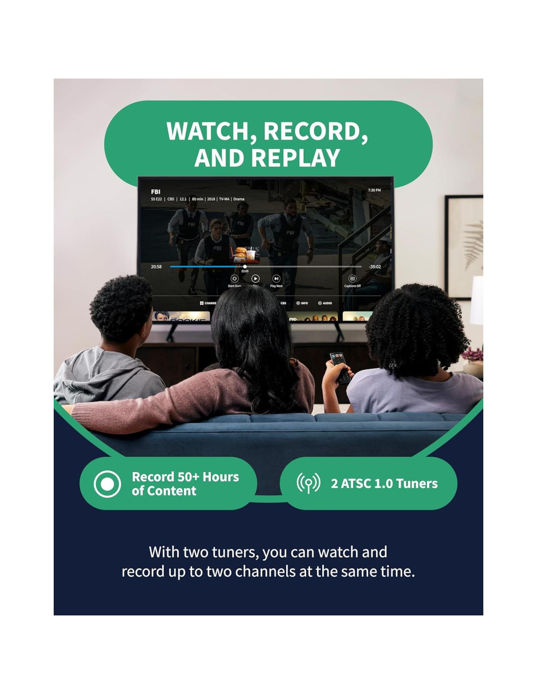 - GRABA MÚLTIPLES PROGRAMAS: 2 sintonizadores ATSC 1.0 dentro del dispositivo te permiten grabar un canal de TV en vivo mientras miras otro para mayor flexibilidad de visualización.