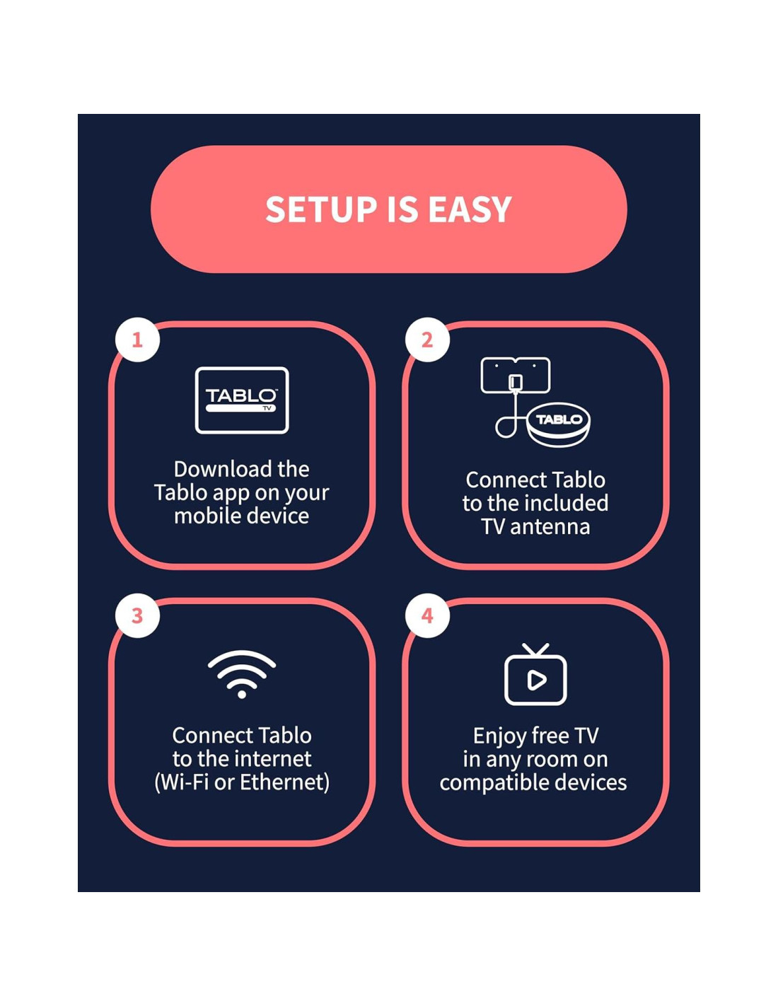 - CONFIGURACIÓN FÁCIL: Conecta el DVR Tablo a la antena de TV interior con el cable coaxial de 6' incluido; conecta Tablo a tu red doméstica a través de Wi-Fi o usando el cable Ethernet incluido; descarga la aplicación Tablo en tu dispositivo móvil y sigue las instrucciones de configuración(4). Escanea el código QR en la Guía de Inicio Rápido incluida (Manual de Instalación) que te guiará a través de toda la configuración del producto.