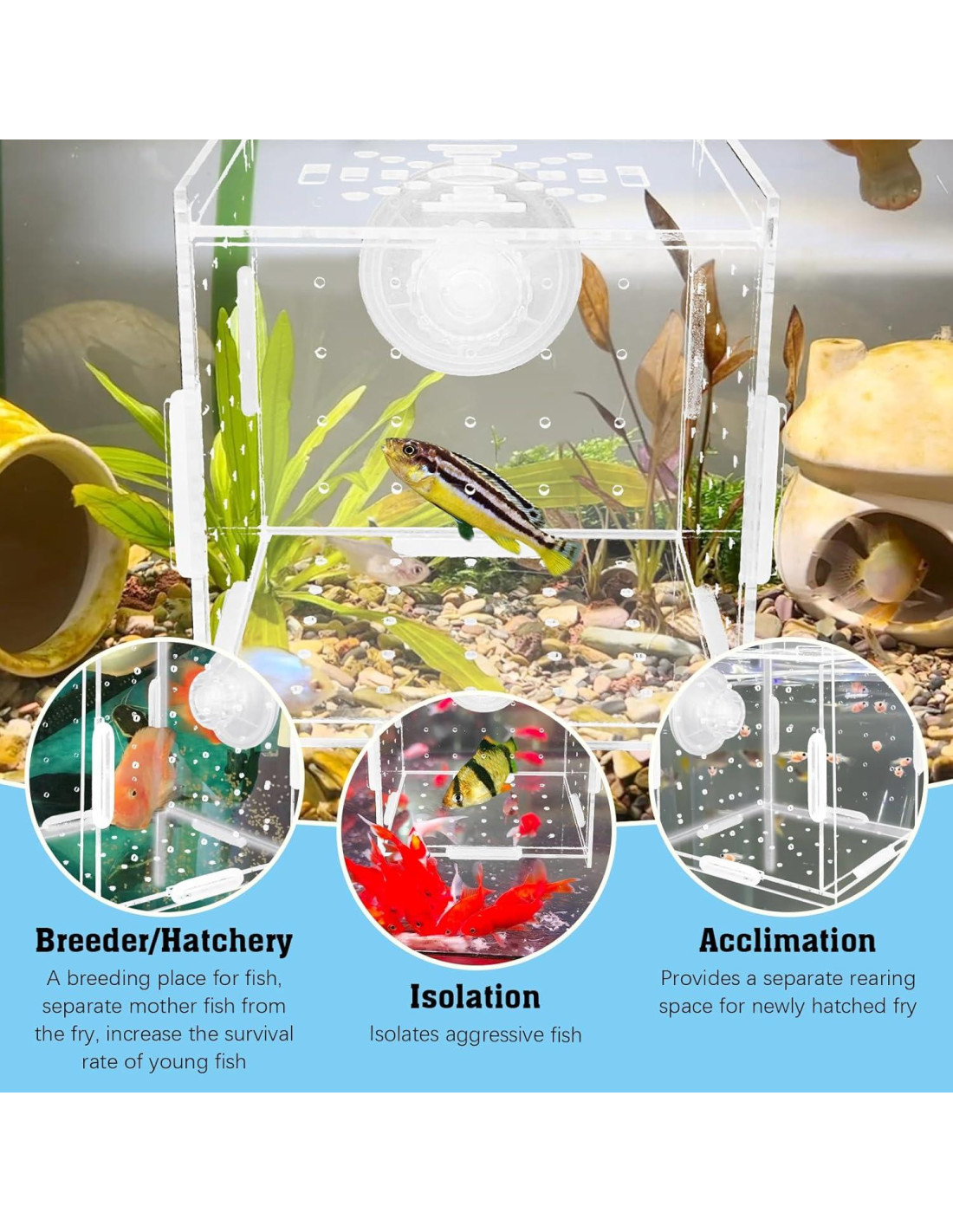 - MATERIAL DE ALTA CALIDAD: Caja de cría de peces de acrílico hecha de material acrílico transparente de alta calidad, tanque seguro y protegido para criar, aislar o aclimatar peces, también es fácil ver a tus peces bebés. Es resistente, a prueba de roturas y fácil de limpiar