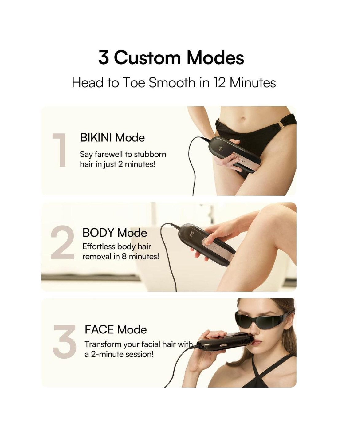 - Tratamiento Completo en Solo 12 Minutos: Realiza un tratamiento completo en solo 12 minutos en las axilas, piernas, espalda, pecho y otras partes del cuerpo. Recomendamos que los nuevos usuarios comiencen en el Nivel 1 y aumenten. El Modo Auto-Deslizante con velocidad de destello acelerada permite una depilación rápida, fácil y segura en casa.