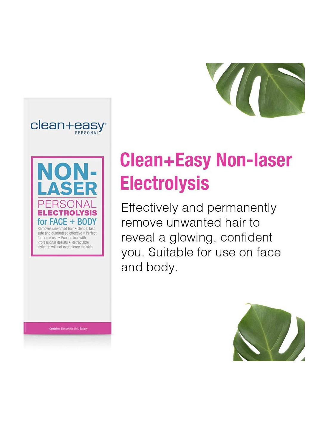 - Incluido en este kit está la unidad de Electrólisis Personal Clean and Easy con estilete de repuesto y pinzas, además de un espejo de aumento. La Electrólisis sin láser es un dispositivo que funciona con batería.