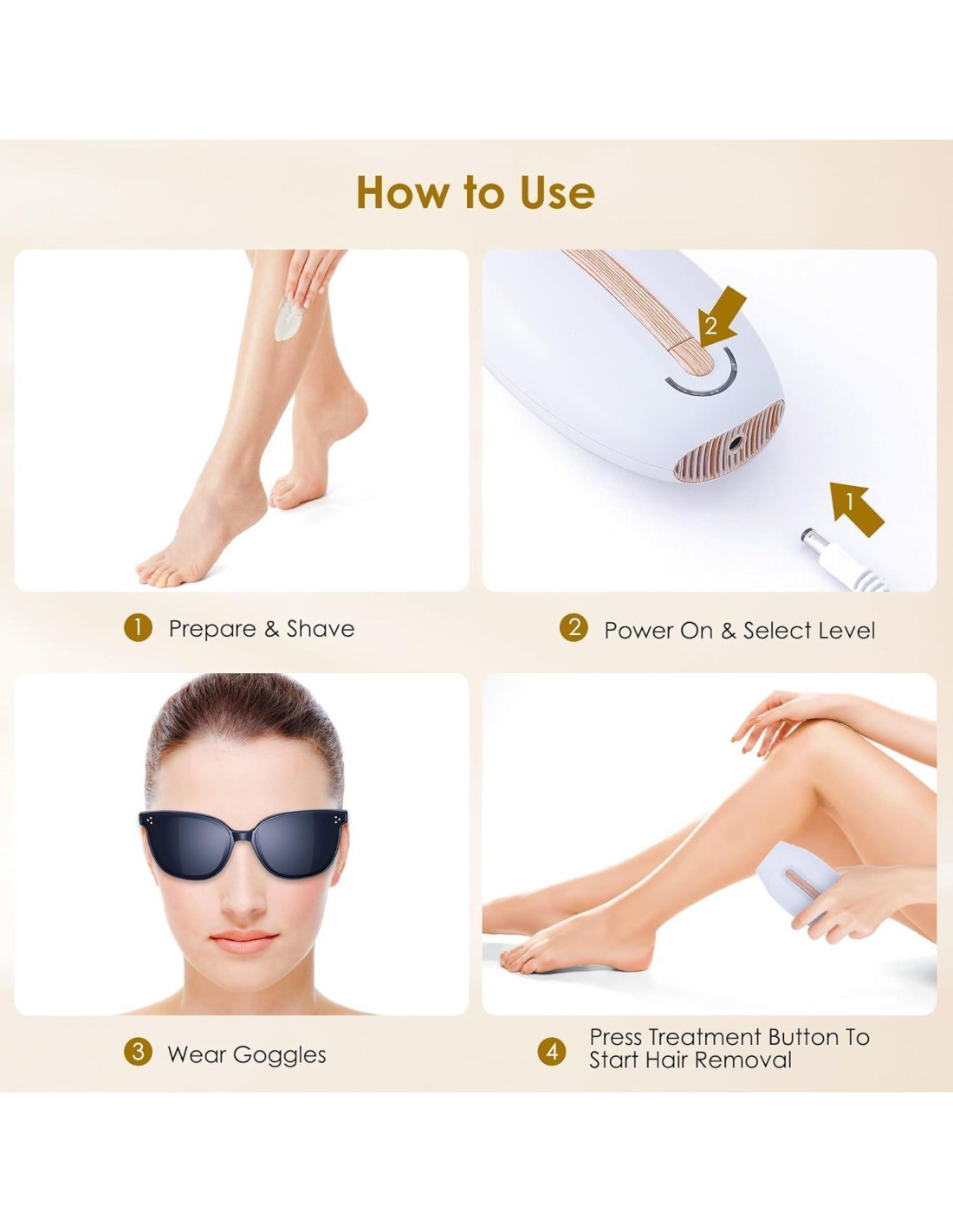 - [Soporte al Cliente Premium] -- Si tienes algún problema, por favor contáctanos a través de www.amazon.com>Tu Cuenta>Tus Pedidos>Encuentra tu pedido y haz clic en 'Contactar al vendedor'. Lo que obtienes: Incluye 1x Dispositivo de Depilación IPL, 1x maquinilla de afeitar, 1x cargador, 1x gafas protectoras y 1x manual de instrucciones. Sigue las instrucciones en el manual incluido para eliminar el vello corporal más rápido.