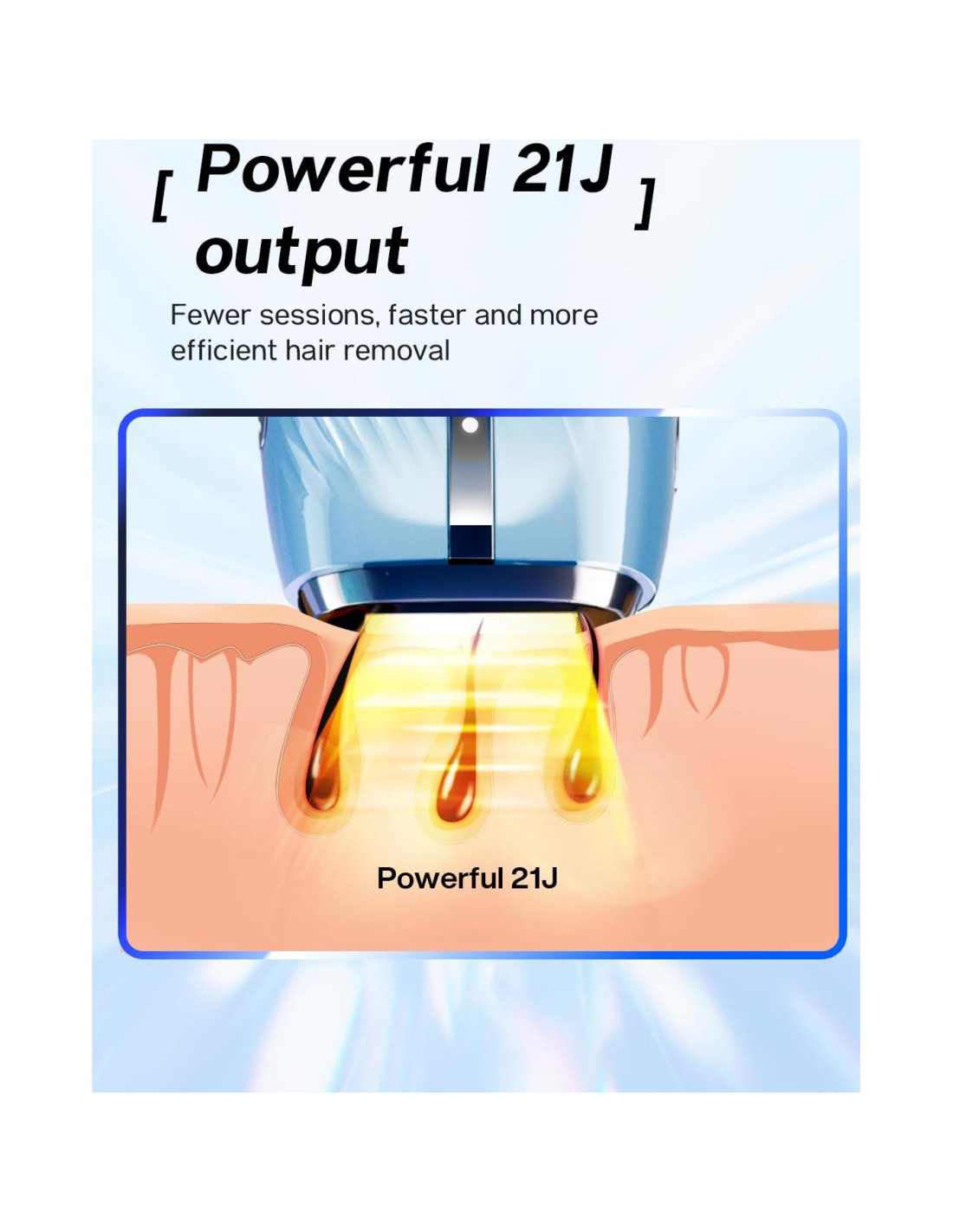 - [21J Energía Poderosa] Redefinimos la eficiencia en la depilación IPL con nuestra potente salida de energía de 21J sobre una ventana de 3cm. Este enfoque de alta energía apunta de manera más efectiva a los folículos pilosos en varias partes del cuerpo, incluyendo la cara, área del bikini, axilas, piernas, espalda, pecho, brazos, mentón y labios, reduciendo notablemente la frecuencia de tratamientos necesarios