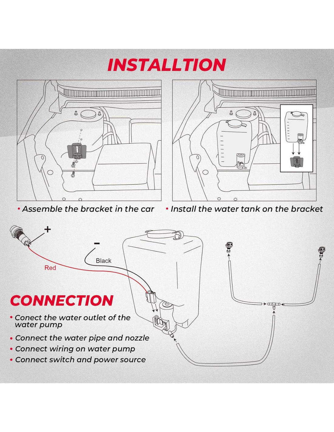 - Paquete: El paquete incluye un tanque de limpiaparabrisas KEMIMOTO, tubo de agua y hardware necesario. Se incluyen instrucciones. Se recomienda encarecidamente la instalación profesional