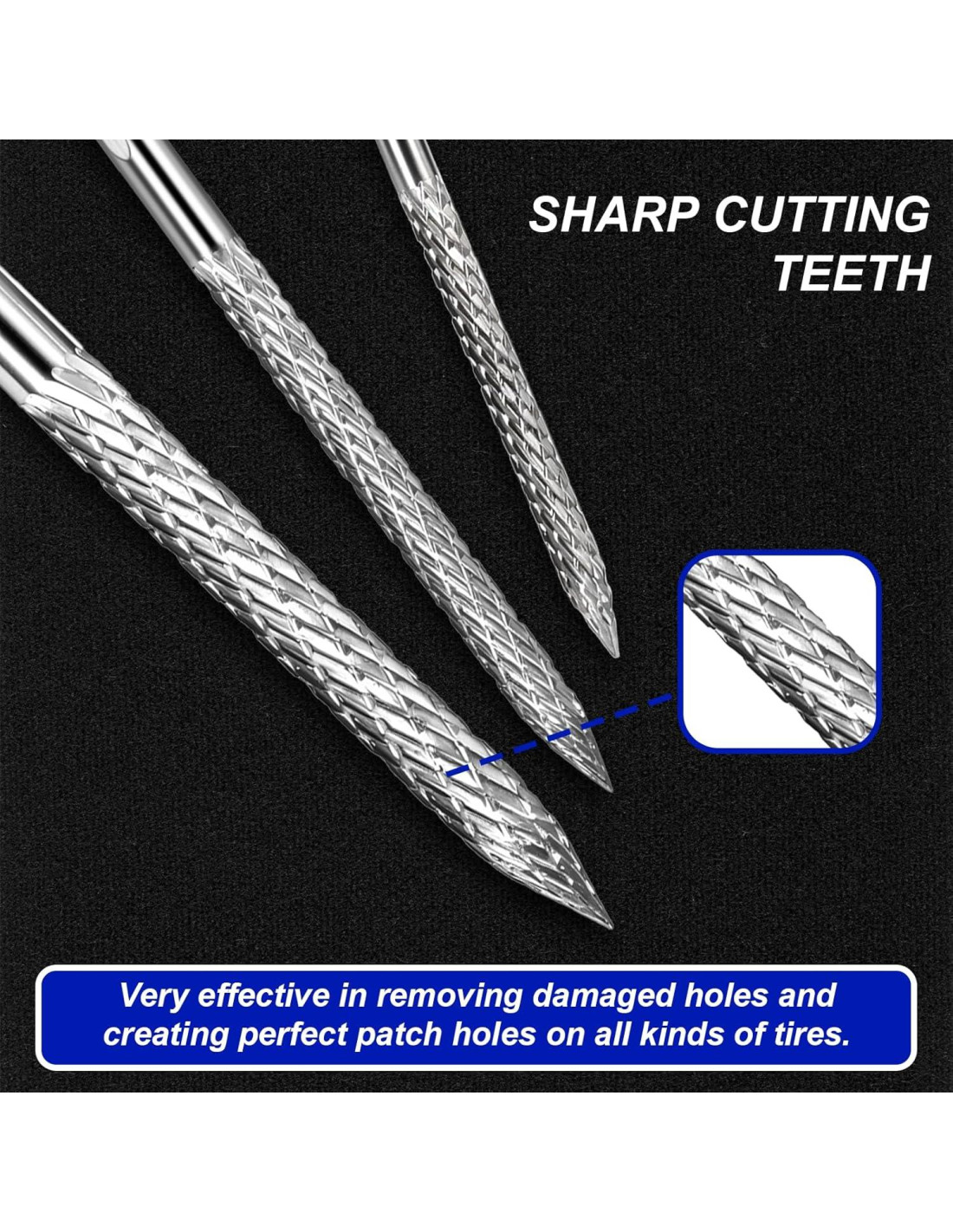 - Material Premium: Hecho de acero de aleación dura, estos kits de parches para neumáticos son excepcionalmente resistentes, resistentes al desgaste y afilados. La cabeza cortadora de broca de acero de tungsteno ofrece mayor dureza y mayor resistencia al desgaste y al calor en comparación con las brocas de acero al carbono típicas