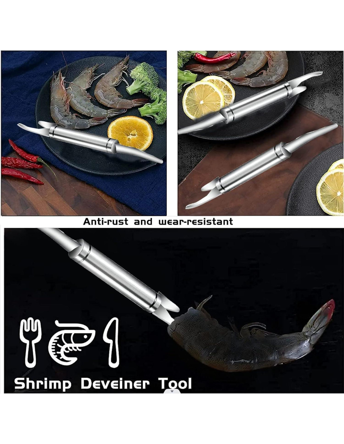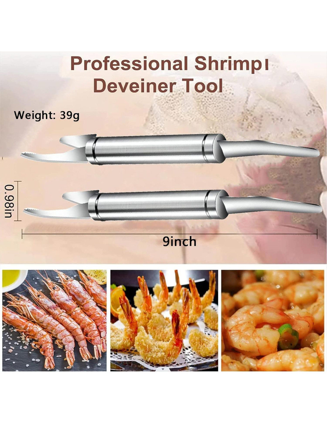 - DISEÑO DE PICO DE ÁGUILA: Diseñado con un pico de águila en un extremo para perforar directamente en la parte posterior del camarón, pelar la cáscara en un segundo y obtener la carne completa del camarón.