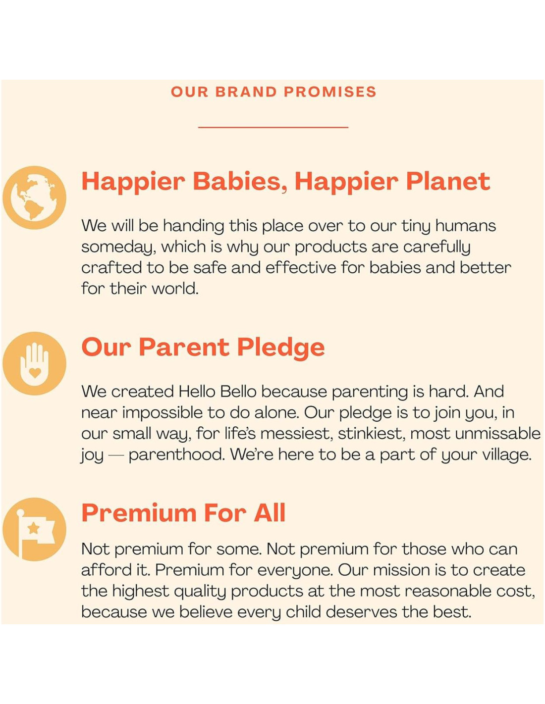 Los Pañales Premium para Bebés Hello Bello están diseñados por padres, así que sabemos de primera mano que prevenir fugas y explosiones es un must. Hemos estado allí, lo hemos hecho, no queremos lidiar con eso. También queríamos crear un pañal con ingredientes de los que pudiéramos estar orgullosos, que fuera suave para la piel sensible y que se hiciera con la misma consideración por el planeta en el que vivimos que por los bebés que amamos, todo a un precio asequible. Así que eso es exactamente lo que hicimos. Con puños de pierna premium y gruesos para una protección seria contra fugas y un núcleo avanzado que rápidamente aleja la humedad para ayudar a minimizar las condiciones que llevan a la irritación. Estos pañales se mantienen ceñidos cuando están sucios, reduciendo el deslizamiento y manteniendo un ajuste seguro y cómodo.