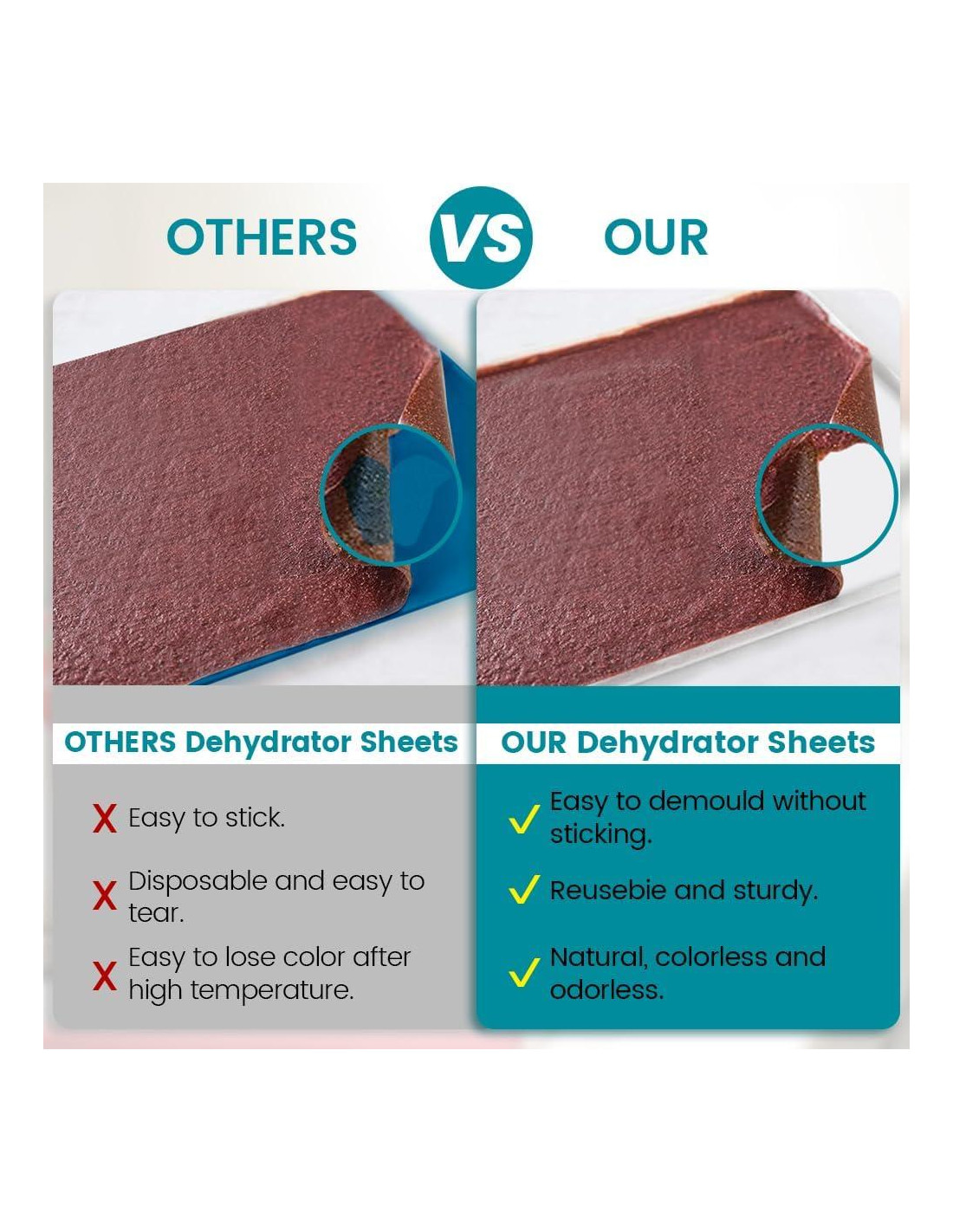 - [Silicona de Grado Alimenticio] Las bandejas de deshidratador de silicona están hechas de silicona natural 100% libre de BPA, sin colorantes, no tóxica y antiadherente. La silicona pura tiene alta suavidad, por lo que necesita ser utilizada junto con bandejas de acero inoxidable. Adecuada para temperaturas bajas y altas