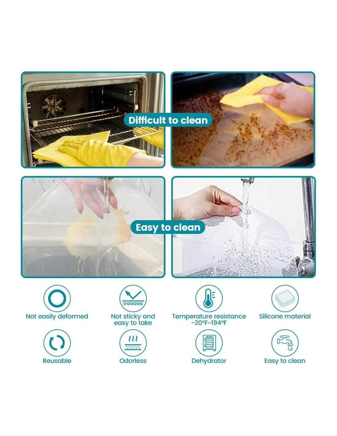 - [Fácil de Limpiar] Estas bandejas de silicona para deshidratador ayudan a mantener nuestros alimentos deshidratados sin pegarse a las estanterías. Se pueden lavar en el fregadero y en el lavavajillas con solo jabón para platos regular y agua tibia, mucho más fácil que tener que lavar las estanterías del deshidratador