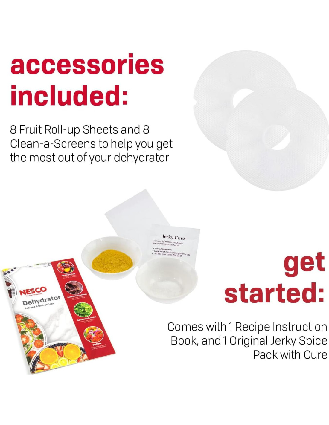 - ACCESORIOS INCLUIDOS: Incluye 8 hojas para rollos de fruta, 8 pantallas de limpieza, 1 libro de instrucciones de recetas, 1 paquete de especias para jerky original con cura