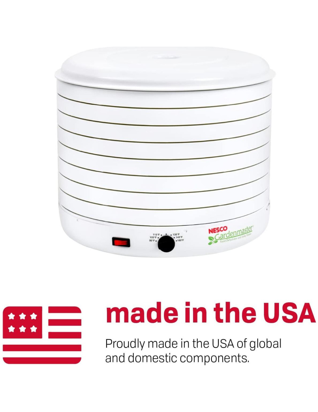 El deshidratador de alimentos NESCO FD-1018A Gardenmaster es 1000 vatios de pura potencia de secado. Con la tecnología Converga-Flow, el aire es forzado hacia arriba y a través de las bandejas hacia el centro, proporcionando un secado rápido, uniforme y nutritivo de tus alimentos favoritos. Cada una de las 8 bandejas son libres de BPA y se pueden expandir hasta 30 bandejas. Un control de temperatura ajustable de 95F-160F (35C-71C) acomoda una variedad de alimentos. Puedes secar más alimentos más rápido con el deshidratador de alimentos NESCO Gardenmaster. Este modelo incluye 8 hojas para rollos de fruta, 8 pantallas de limpieza, una muestra de condimento y cura para jerky, y un libro de recetas e instrucciones de 52 páginas.