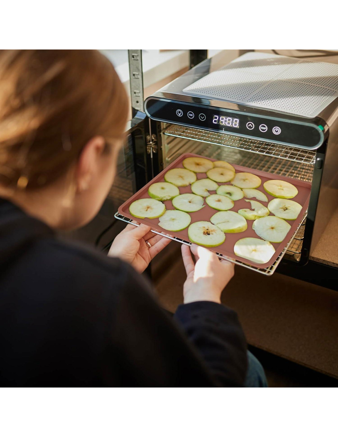 - Superficie antiadherente: Las suaves hojas de silicona evitan que los alimentos se peguen, haciendo que la extracción y la limpieza sean sencillas. Hojas deshidratadoras de silicona antiadherentes