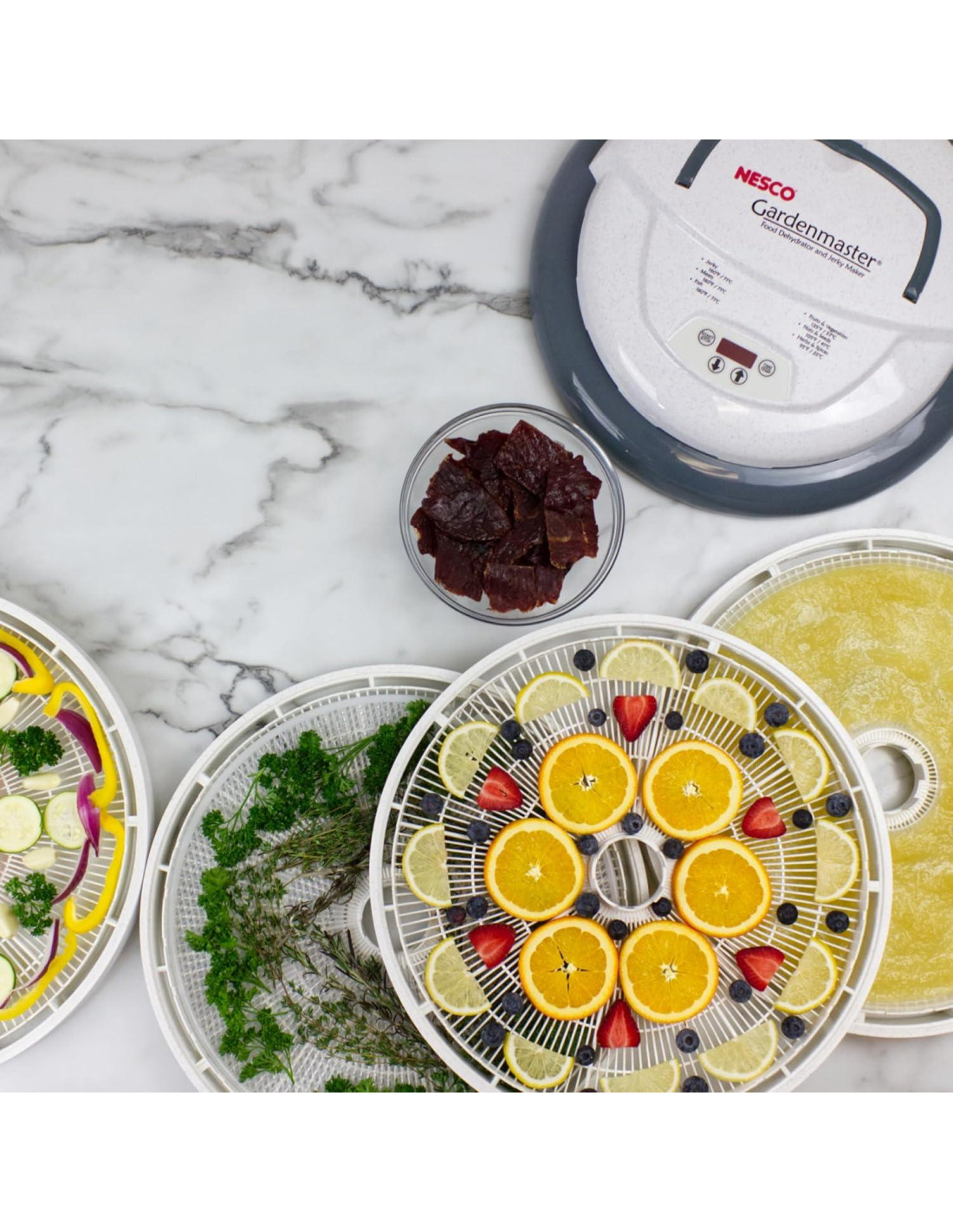 - ACCESORIOS INCLUIDOS: Incluye 1 hoja para rollo de frutas, 1 pantalla de limpieza, una muestra de condimento y curado para carne seca, y un libro de recetas e instrucciones de 52 páginas