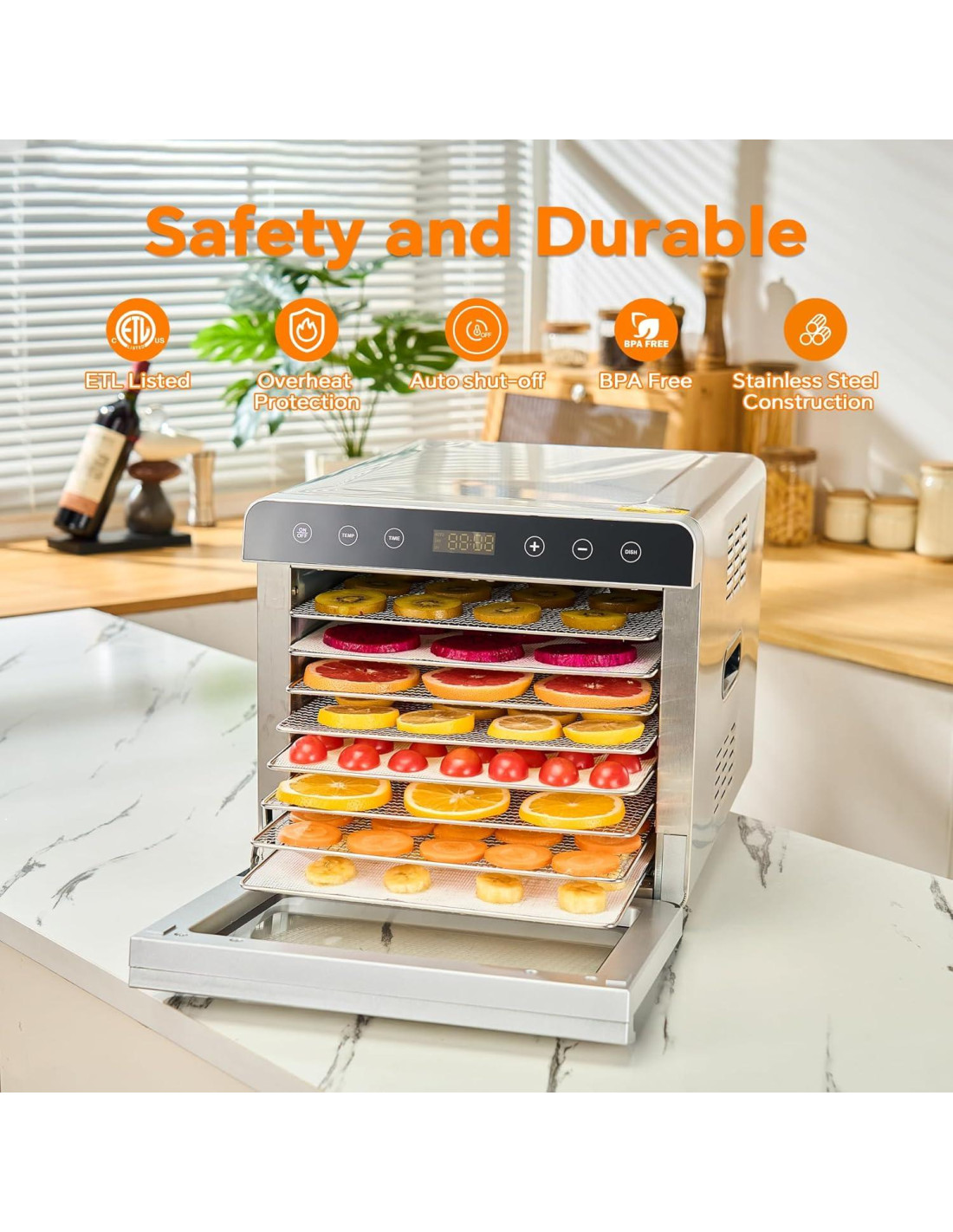 - [Sistema de Circulación de Aire Térmico Horizontal] Deshidratador eficiente de acero inoxidable de 700W, tecnología de circulación de aire caliente horizontal de 360 para una distribución uniforme del calor, perfecto para jerky casero, bocadillos, especias, golosinas para mascotas, yogur, nueces, galletas, etc.