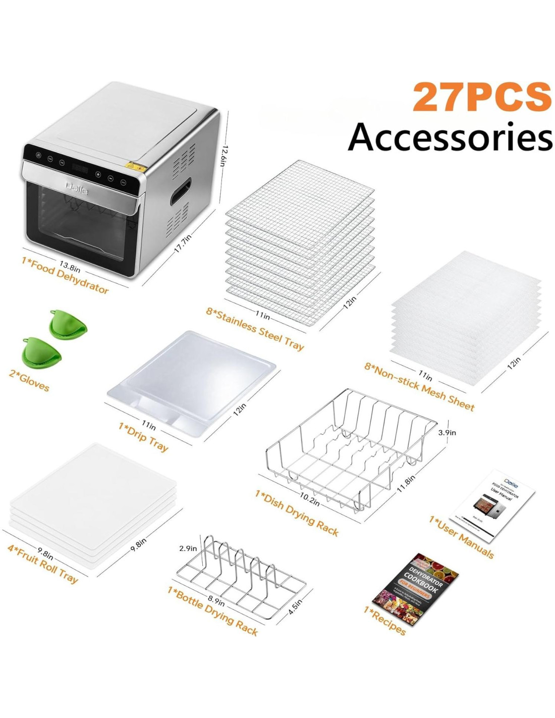 - [Hasta 27 Accesorios] Nuestro deshidratador SS-08B viene con 8 bandejas de secado de acero inoxidable, 8 hojas de malla antiadherente, 4 bandejas para rollos de cuero de fruta, 1 bandeja para goteo, 1 estante para secar platos, 1 estante para secar botellas, 1 par de guantes, 1 manual de usuario y 1 receta. Esto facilita la creación de una variedad de bocadillos caseros y golosinas para perros