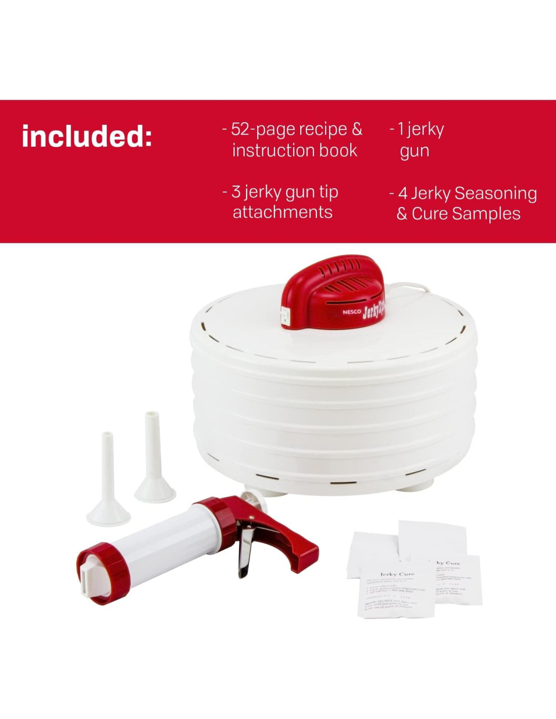 El deshidratador NESCO FD-28JX JerkyXpress es el kit completo de hazlo tú mismo para hacer jerky, perfecto para un principiante o un fabricante de jerky experimentado. Este deshidratador viene con una pistola para jerky y 3 boquillas para hacer tiras o palitos. Se incluyen muestras de sazonadores y paquetes de curado para comenzar. Solo agrega carne molida. Cuenta con 350 vatios, temperatura fija, y una cabeza de potencia montada en la parte superior, perfecta para el principiante o un fabricante de jerky experimentado. La pistola para jerky viene con 3 boquillas. ¡Hace un delicioso jerky de res o de venado! Hay cuatro sabores diferentes de especias para jerky incluidos con esta unidad: Picante, Teriyaki, Original y Pepperoni.