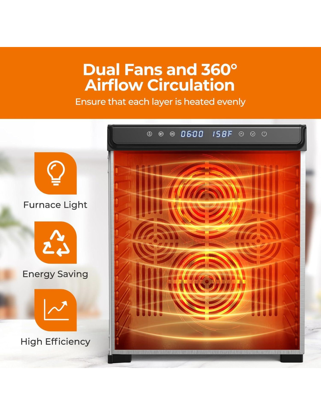 - Secado eficiente con ventiladores dobles: Alimentado por un motor de 1300W y dos ventiladores montados en la parte trasera, este deshidratador de alimentos asegura un secado rápido y uniforme con circulación de aire caliente de 360-no se requiere rotación de bandejas. Perfecto para jerky, frutas, verduras, hierbas y más