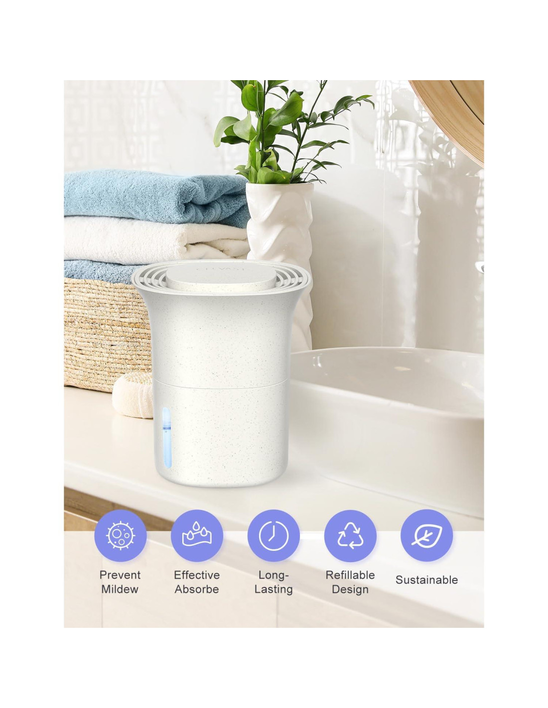 - ABSORBENTES DE HUMEDAD RECARGABLES: La taza absorbente de humedad, fabricada con ABS duradero y paja de trigo, es reutilizable y resistente. Una vez que las perlas deshidratantes se agoten, se puede recargar con gránulos de cloruro de calcio CLEVAST (ASIN: B0DWFBV35B).