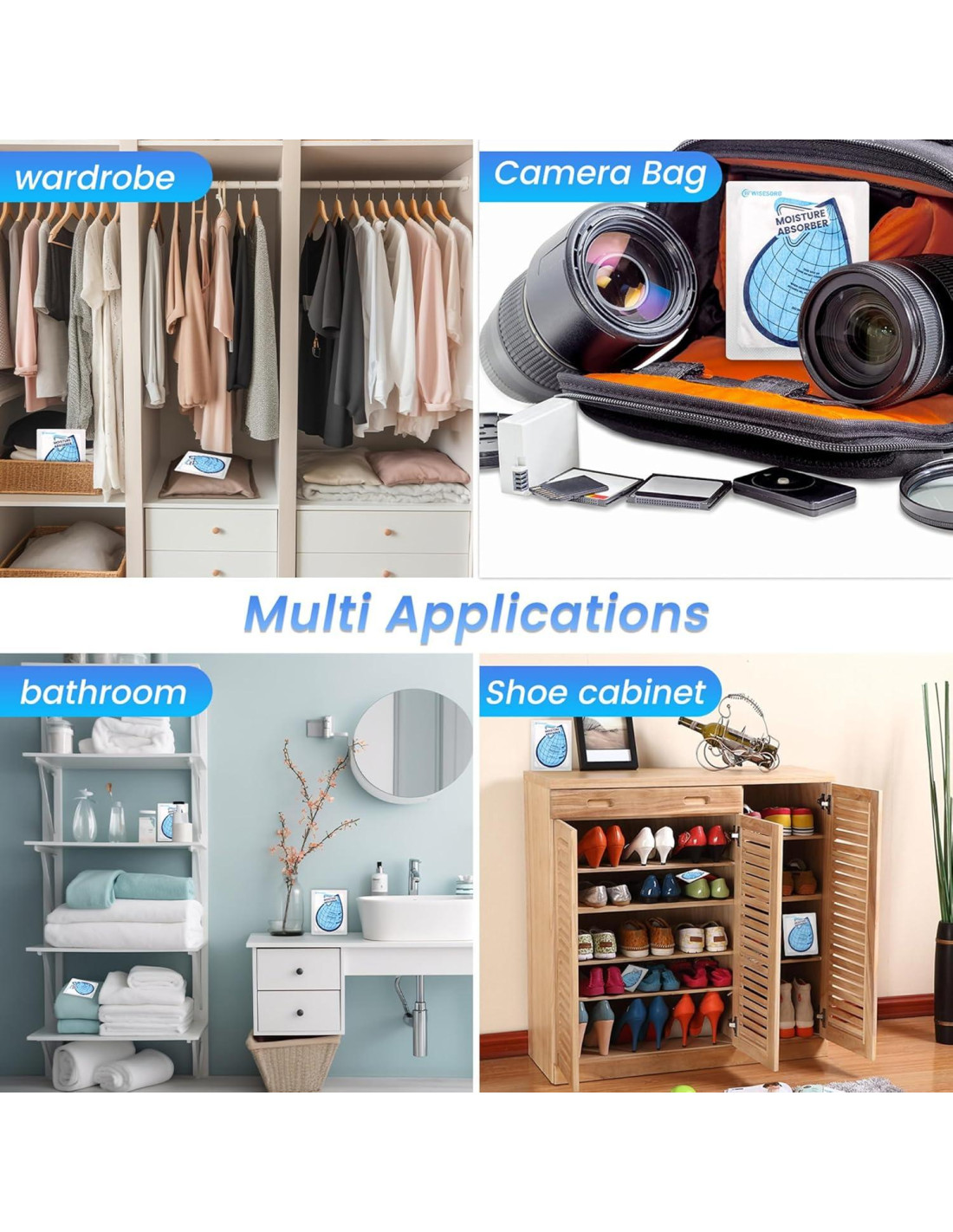 - [Uso Versátil] : Los paquetes absorbentes de humedad se pueden usar en varios lugares, incluyendo closets, armarios, sótanos, lavanderías, hogares, baños, cocinas, armarios de zapatos, automóviles, cajas de arena para gatos, cajas de herramientas, Rvs, casas rodantes y otros espacios cerrados. Estas bolsas absorbentes de humedad protegen efectivamente sus objetos de valor del daño causado por el exceso de humedad y previenen olores. Recuerde mantener el lado de papel hacia arriba para un rendimiento óptimo.