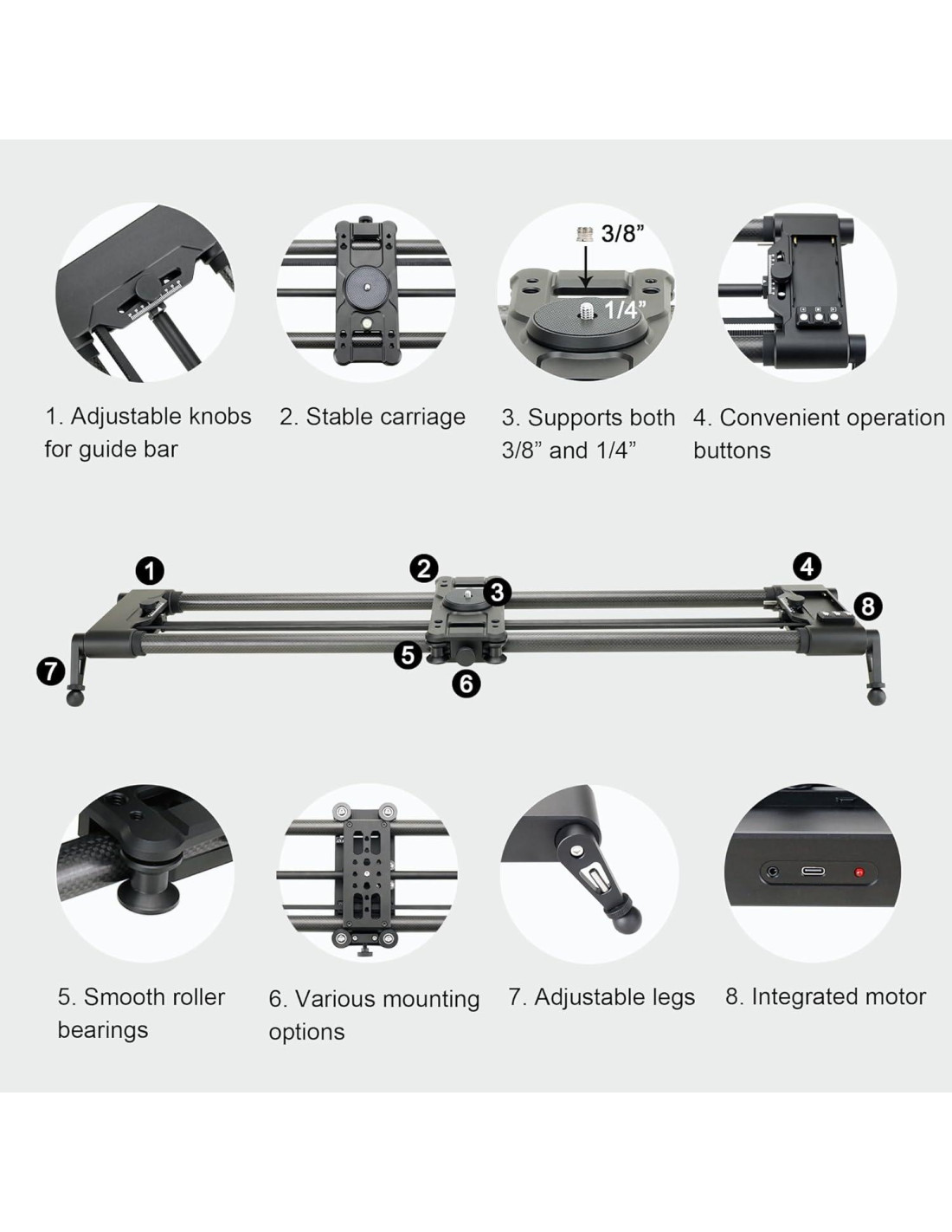 - Conexión bluetooth inalámbrica usando dispositivo móvil (soporta IOS y Android), el motor está integrado con el deslizador, por lo que el usuario no necesita configurar hardware antes de usar. Puede hacer tomas de video, time lapse y animación de stop motion.