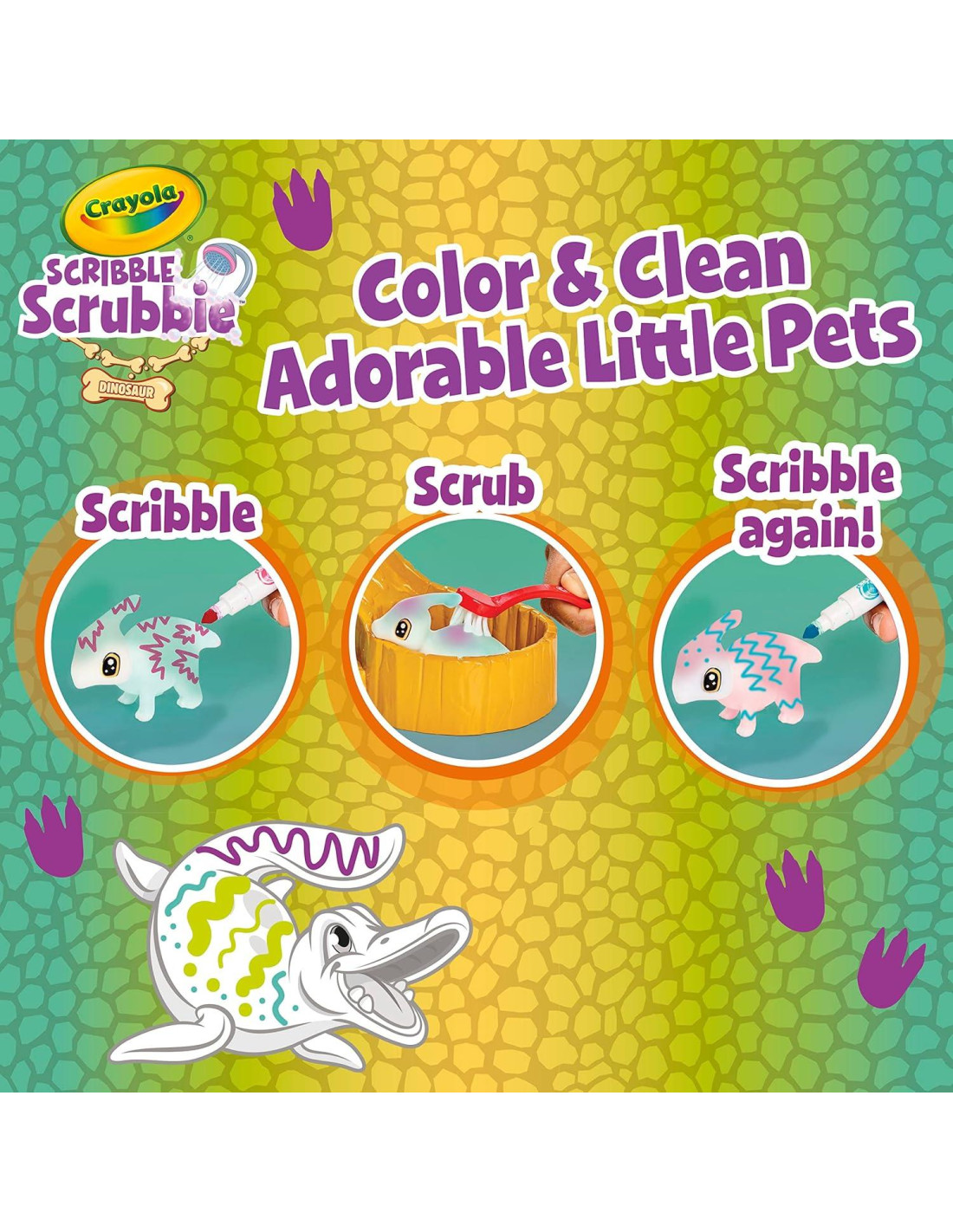 - SCRIBBLE SCRUBBIE MASCOTAS: Incluye 1 Entorno de Cascada, 4 Mascotas Dinosaurios, 3 Marcadores Lavables, 3 Botellas de Gotas de Color y 1 Cepillo de Cuidado