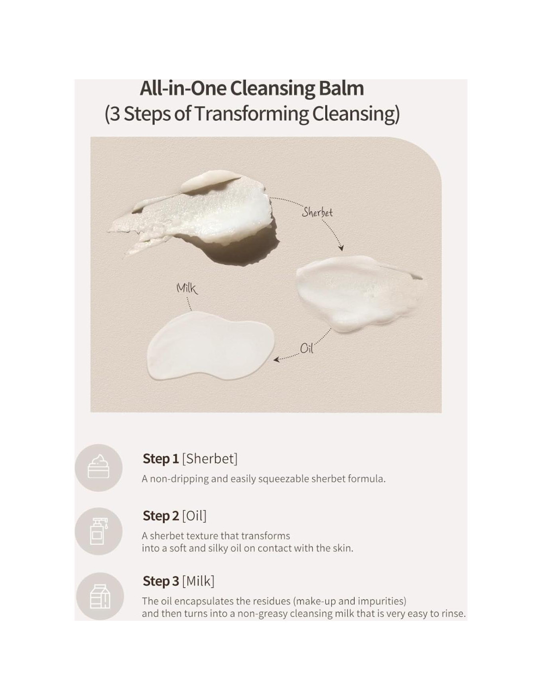 - [Todo en Uno] Una textura de sherbet que se transforma en un aceite suave y sedoso al contacto con la piel y luego emulsionado en una leche aterciopelada al contacto con el agua. El aceite encapsula los residuos (maquillaje e impurezas) y luego se convierte en una leche limpiadora no grasa que es muy fácil de enjuagar. Tu piel queda profundamente limpia así como suave y flexible con este bálsamo limpiador todo en uno de un solo paso. Estos 3 pasos de limpieza transformadora (sherbet-aceite-leche) son perfectos para un limpiador facial diario.