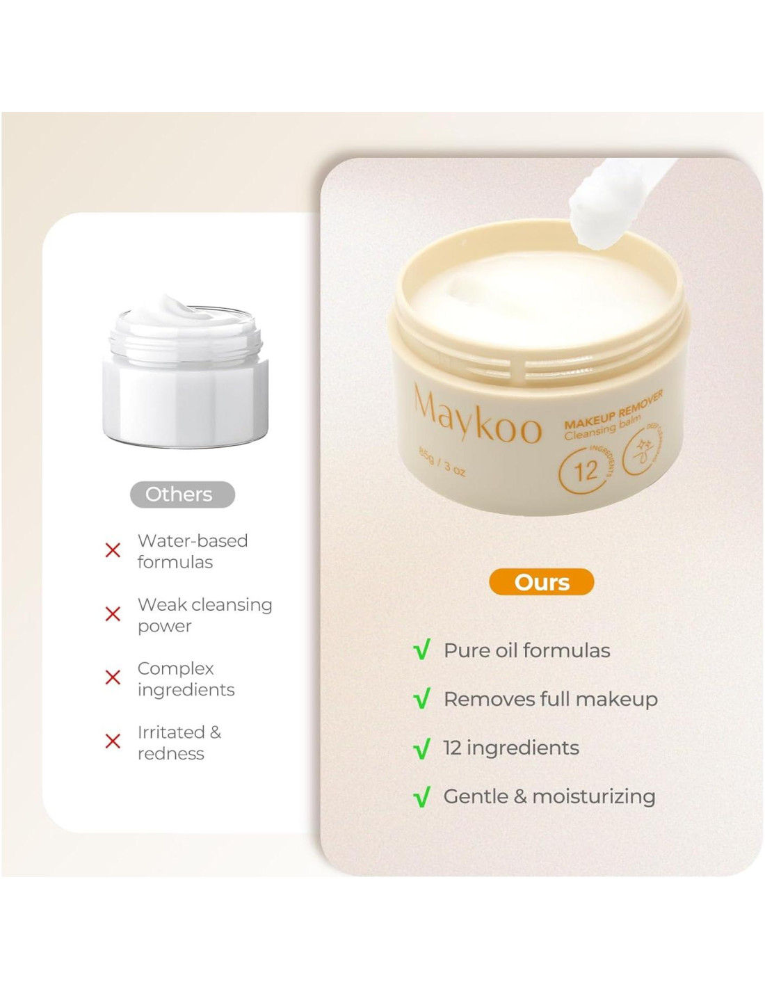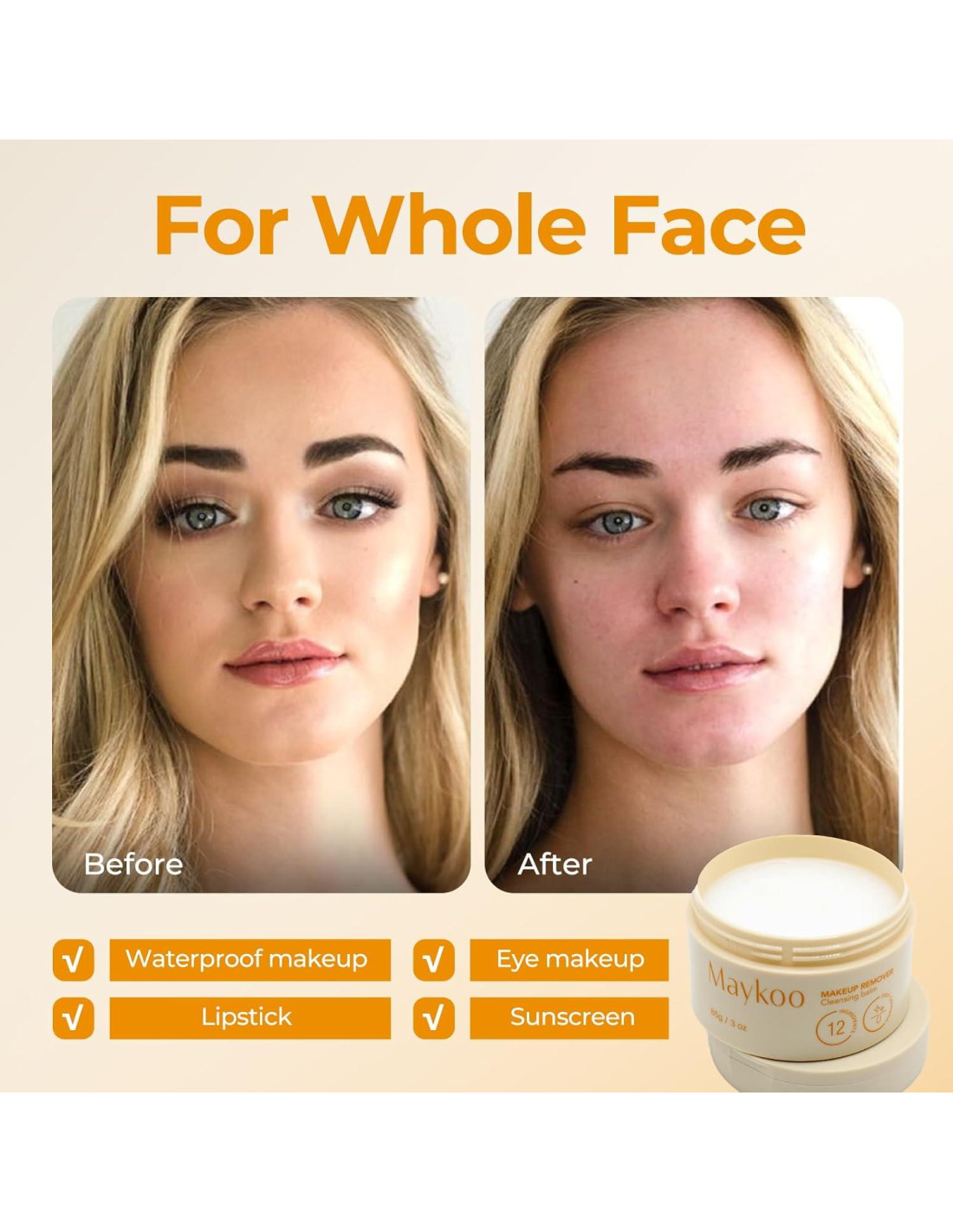 - [Limpieza e Hidratación 2 en 1] El bálsamo desmaquillante MAYKOO derrite sin esfuerzo el maquillaje, protector solar y suciedad, incluso el maquillaje resistente al agua. El bálsamo limpiador permite que la piel se limpie profundamente mientras nutre e hidrata, manteniendo el equilibrio de humedad de la piel.