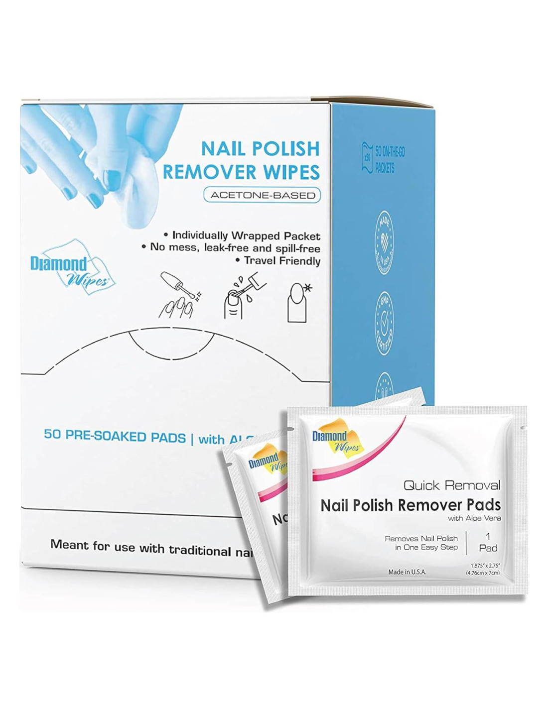 - DESMAQUILLANTE DE ESMALTE DE UÑAS - Elimina fácilmente y rápidamente el esmalte de uñas y cambia los colores de las uñas en cualquier momento con nuestras toallitas con acetona. Estos almohadillas desmaquillantes de esmalte de uñas de tamaño de viaje contienen la fórmula original de acetona de Diamond Wipes, aloe vera y vitamina E para limpiar y acondicionar tus uñas.