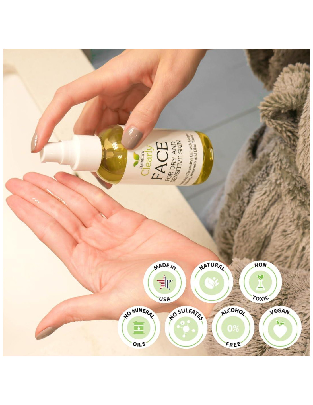 Clearly FACE es un limpiador facial de aceite premium y desmaquillante, diseñado específicamente para aquellos con piel seca y sensible. Infundido con aceites nutritivos como escualano vegano, borraja, argán, aguacate y tanaceto azul, nuestra fórmula suave e hidratante proporciona una limpieza profunda sin obstruir los poros. Cargado con antioxidantes naturales, vitaminas y ácidos grasos, nuestro aceite limpiador nutre tu piel, dejándola suave, flexible y radiante. Nuestro lujoso limpiador a base de aceite disuelve sin esfuerzo el maquillaje, la suciedad y el aceite, mientras calma tu piel y realza su brillo natural. Clearly FACE es el tratamiento facial diario perfecto para aquellos que buscan una limpieza nutritiva hecha con los ingredientes naturales más puros y potentes. Usa Clearly FACE como tu limpiador facial diario y desmaquillante para apoyar la hidratación y elasticidad, y para calmar la sequedad y sensibilidad. ¡Pruébalo ahora y observa la diferencia que puede hacer en tu piel! Hecho a mano en pequeñas cantidades en EE. UU. con aceites 100% naturales y orgánicos - sin toxinas, rellenos, agua ni conservantes. Simplemente masajea sobre tu piel húmeda y enjuaga con agua tibia o un paño tibio, luego agrega unas gotas para un humectante de aceite natural. Una vez que comiences a limpiar con aceite, nunca volverás a los limpiadores tradicionales.